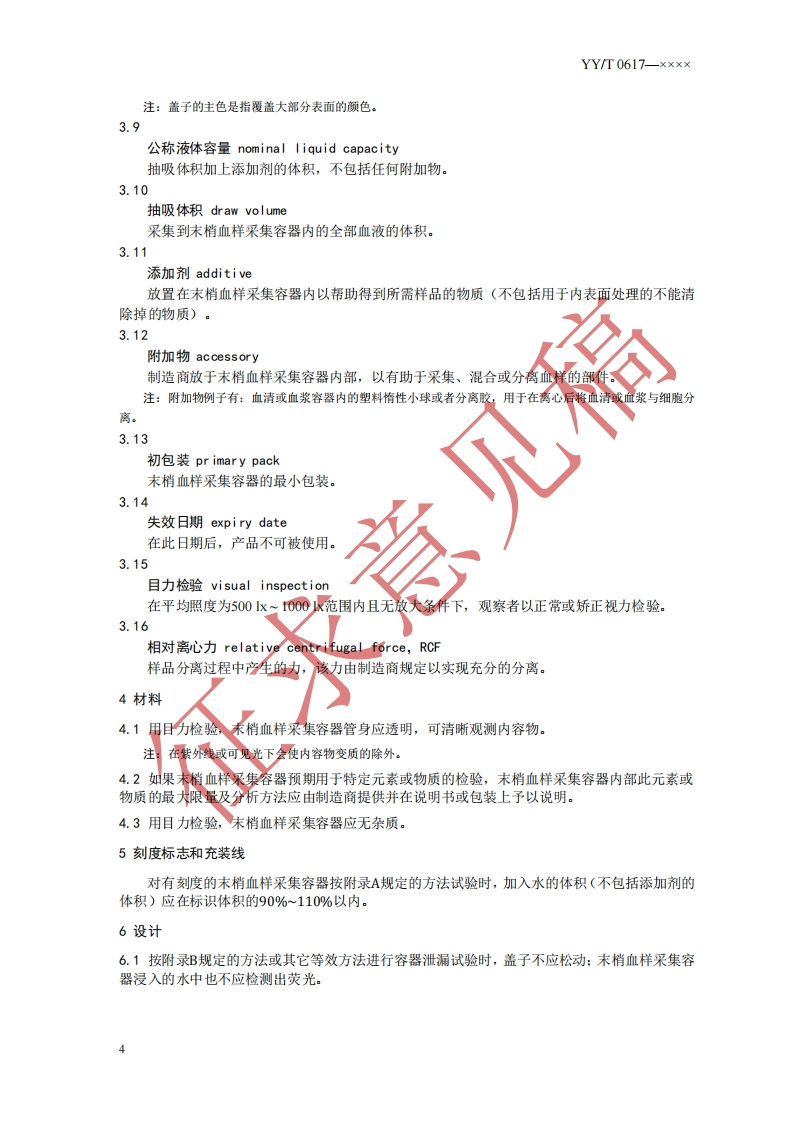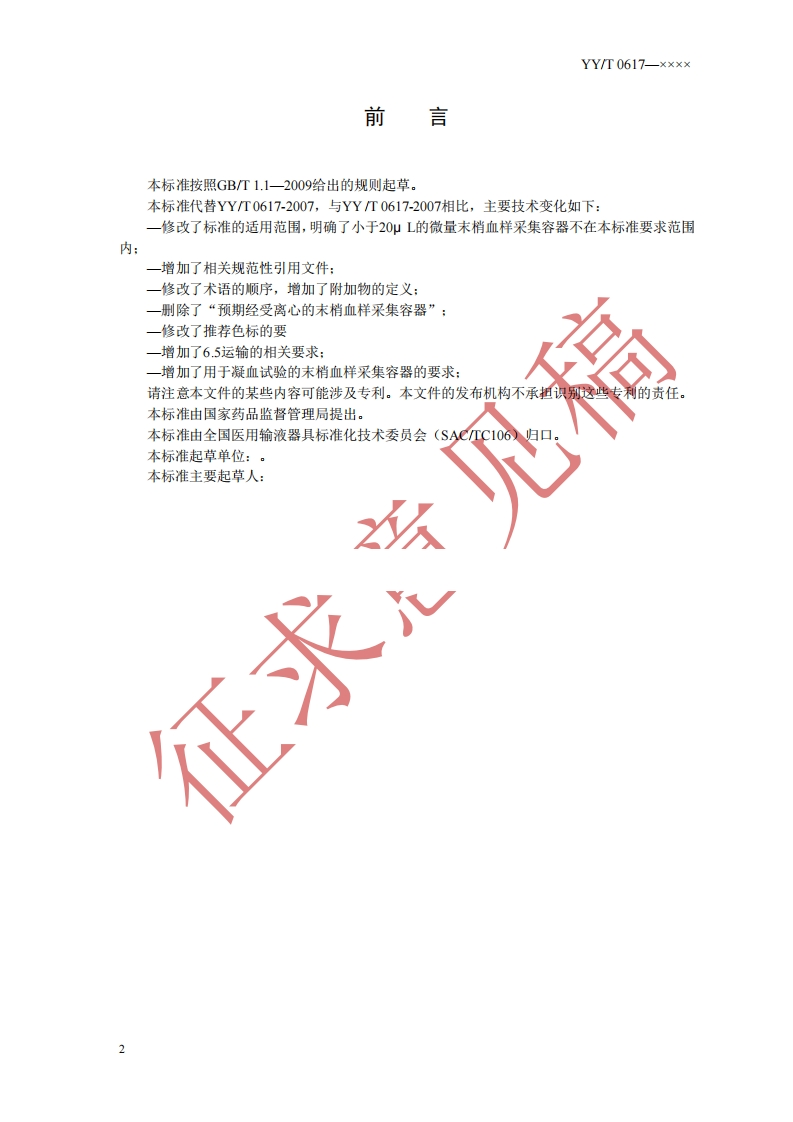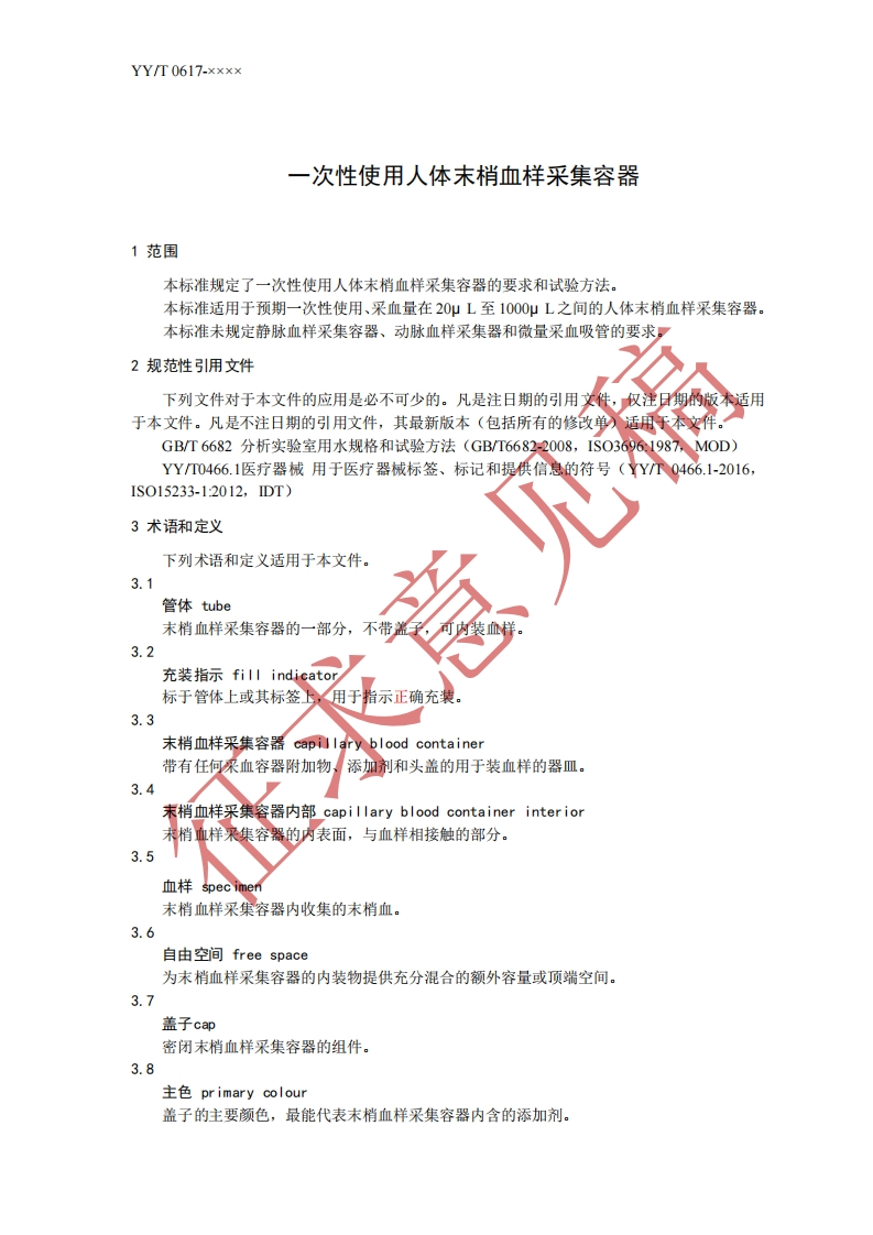 1CS11.120.20C48YY中华人民共和国医药行业标准YYT0617-××××代替YY/T0617-2007一次性使用人体末梢血样采集容器Single-use containers for human capillary blood specimen collection(征求意见稿)(本稿完成日期:2019-07.12)在提交反馈意见时,请将您知道的相关专利连同支持性文件一并附上。××X×-××-××发布××××-××.××实施国家药品监督管理局发布