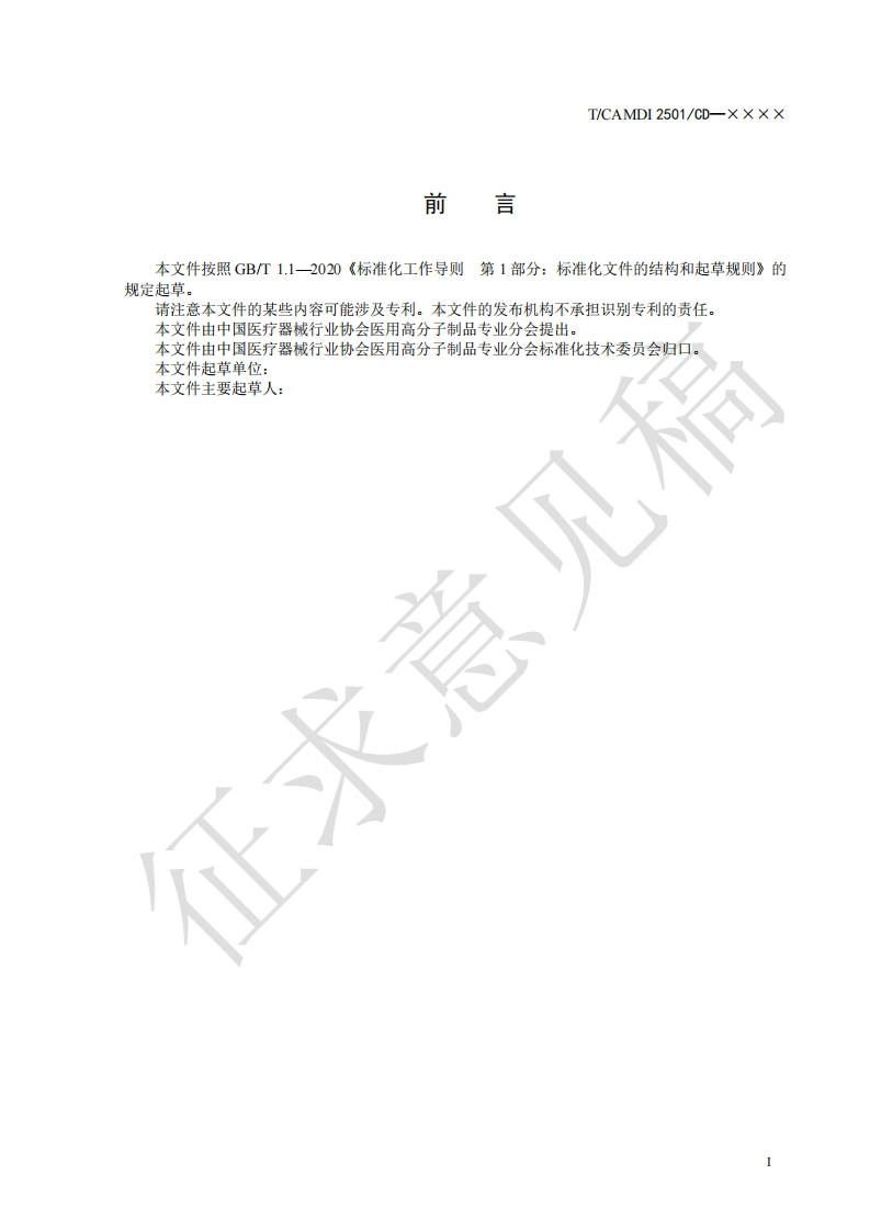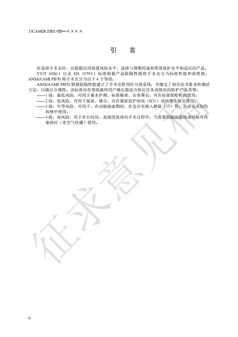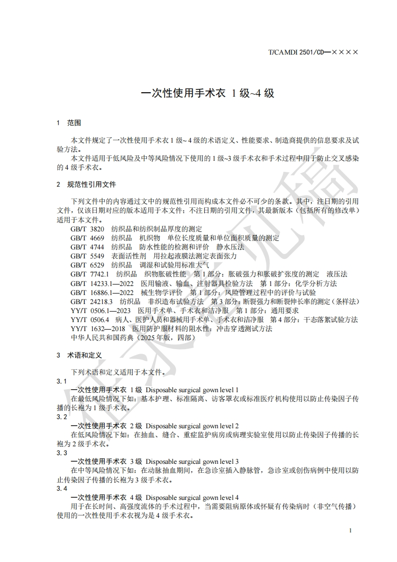 ICS11.040.20CCSC 31中国医疗器械行业协会China Association for Medical Devices Industry团体标准T/CAMDI 2502/CD-X XXX一次性使用手术衣1级~4级Disposable surgical gown level 1~level 4(征求意见稿CD)在提交反馈意见时,请将您知道的相关专利连同支持性文件一并附上。××X×-X×-××发布××××-××-××实施中国医疗器械行业协会发布