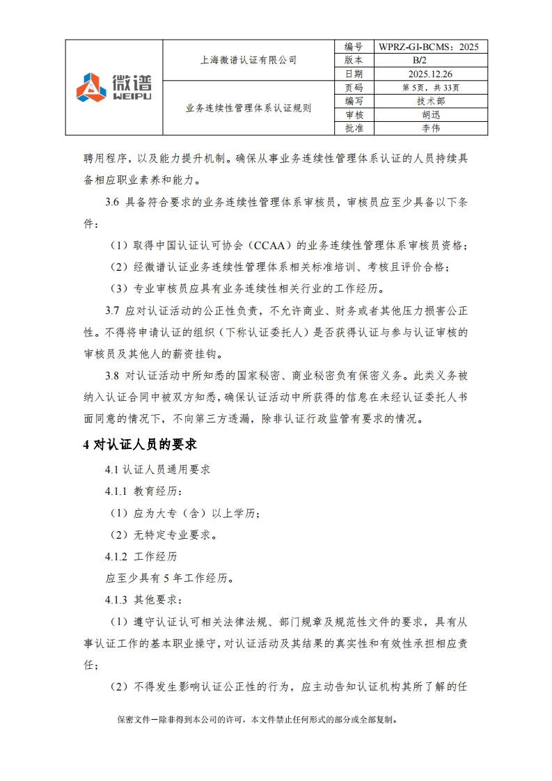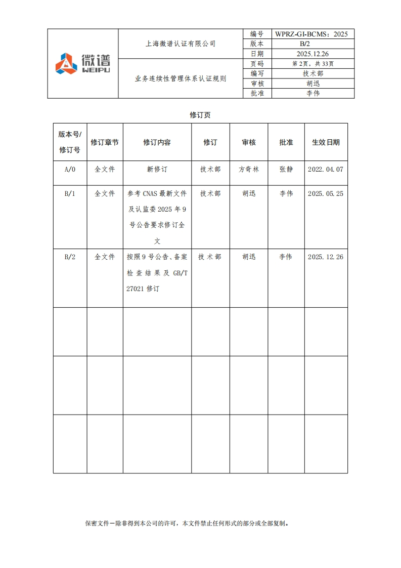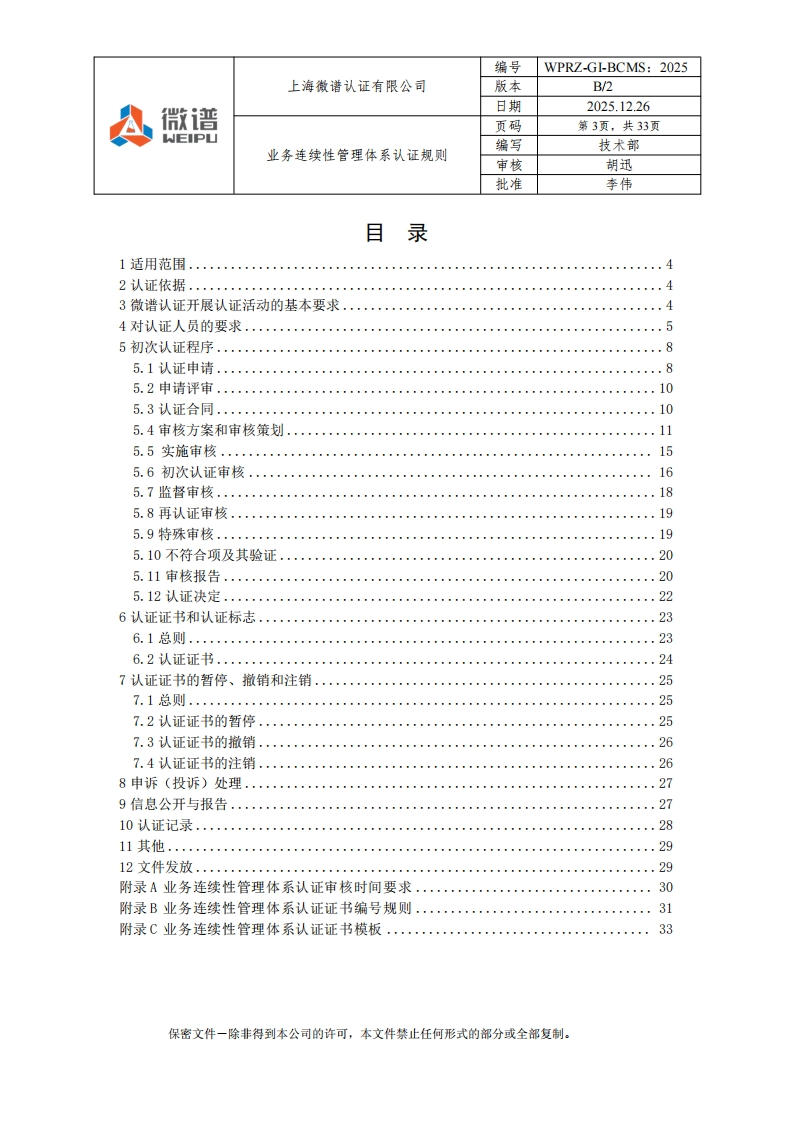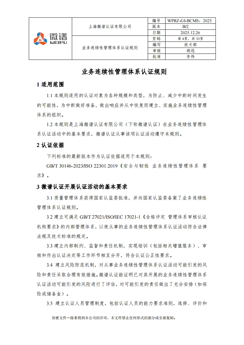 编号WPRZ-GI-BCMS:2025上海微谱认证有限公司版本B/22025.12.26A微谱日期页码第1页,共33页WEIPU编写业务连续性管理体系认证规则技术部审核胡迅批准李伟业务连续性管理体系认证规则文件编号:WPRZ-GL-BCMS:2025版本号:B2编写人:技术部审核人:2批准人:本闻批准日期:2025-12-26注:本规则自批准之日起生效:本规则附录可以单独修订和发布。保密文件一除非得到本公司的许可,本文件禁止任何形式的部分或全部复制。