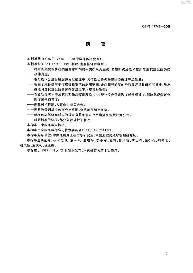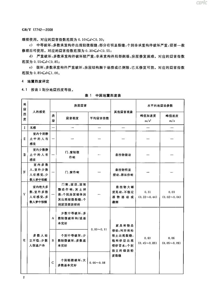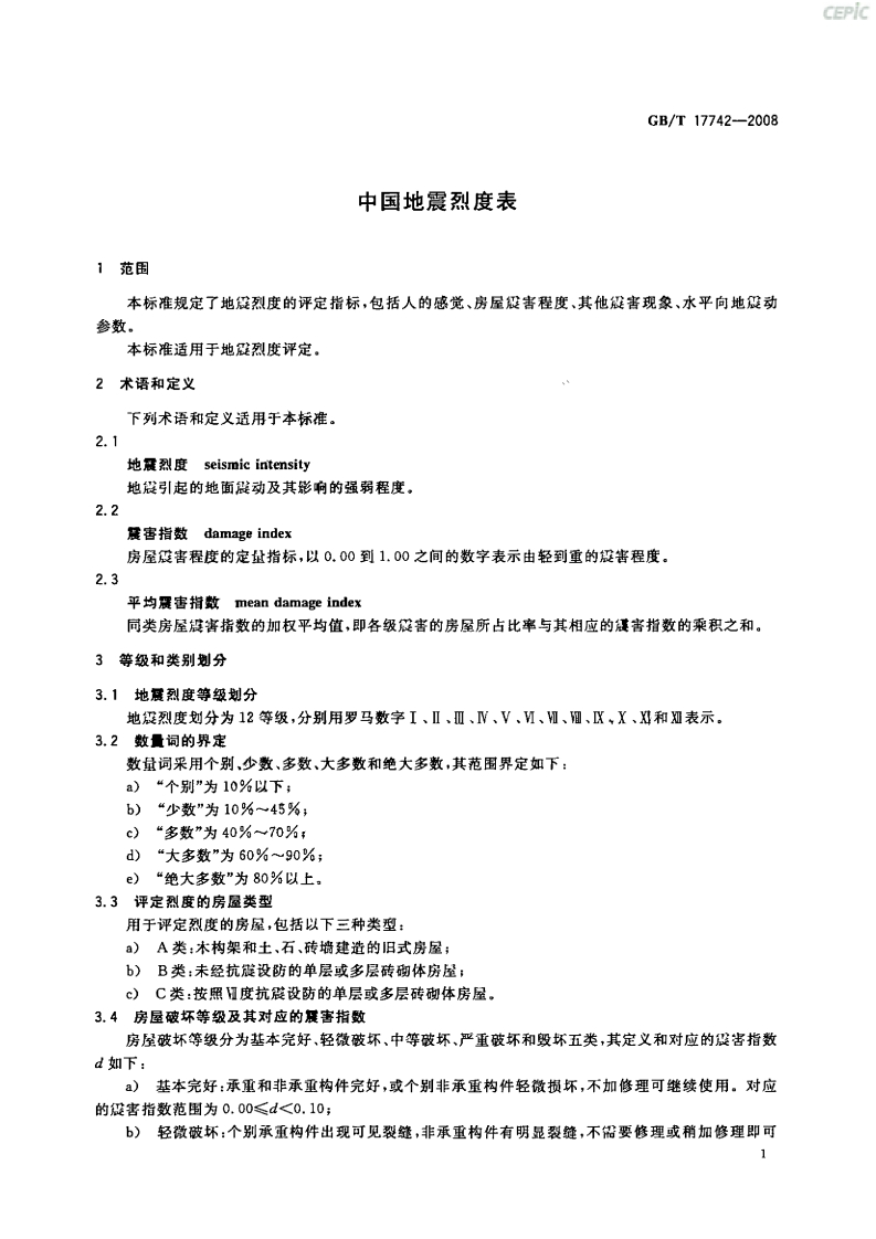 中国地震烈度表TheChineseseismicintensityscale348072@abc昨天发布关注私信0.21MB7页026中国地震烈度表TheChineseseismicintensityscale此内容为付费资源,请付费后查看¥19¥23黄金会员免费钻石会员免费立即购买您当前未登录!建议登陆后购买,可保存购买订单付费资源 第1页 / 共7页 第2页 / 共7页 第3页 / 共7页 第4页 / 共7页 第5页 / 共7页 试读已结束,还剩2页,您可下载完整版后进行离线阅读 THE END标准规范 文本预览 CEPiC中华人民共和国国家标准GB/T17742-2008代替GB/T17742一1999中国地震烈度表The Chinese seismic intensity scale2008-11-13发布2009-03-01实施中华人民共和国国家质量监督检验检疫总局中国国家标准化管理委员会发布 查看更多 收起部分 喜欢就支持一下吧收藏