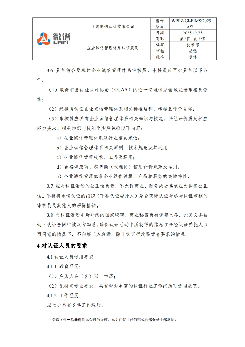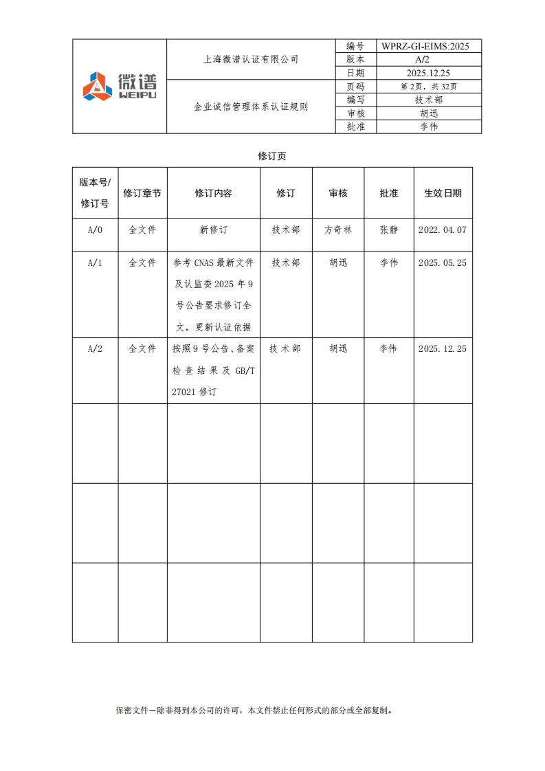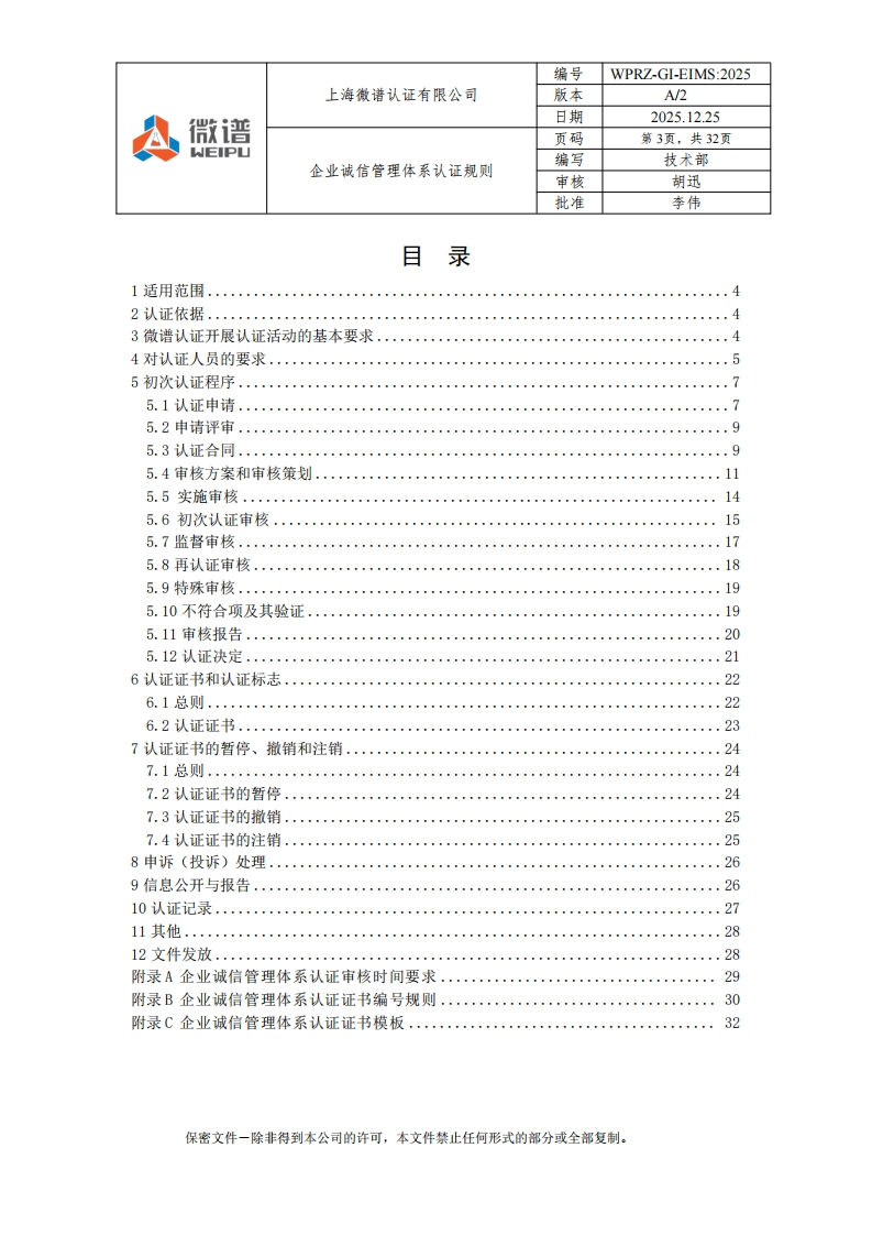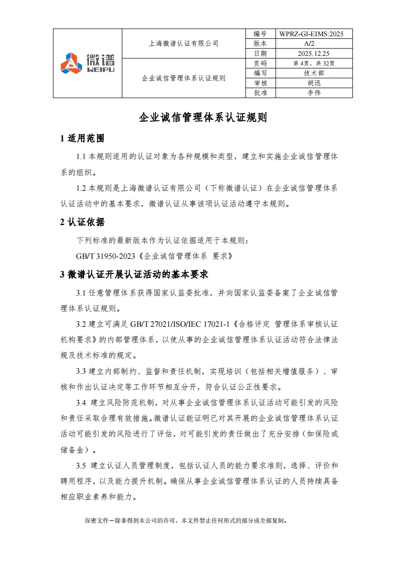 编号WPRZ-GI-EIMS:2025上海微谱认证有限公司版本A/2微谱日期2025.12.25A页码第1页,共32页WEIPU企业诚信管理体系认证规则编写技术部审核胡迅批准李伟企业诚信管理体系认证规则文件编号:WPRZ-GL-EMS:2025版本号:AW2编写人:技术部审核人:地批准人:本南批准日期:2025.12.25注:本规则自批准之日起生效:本规则附录可以单独修订和发布。保密文件一除非得到本公司的许可,本文件禁止任何形式的部分或全部复制。