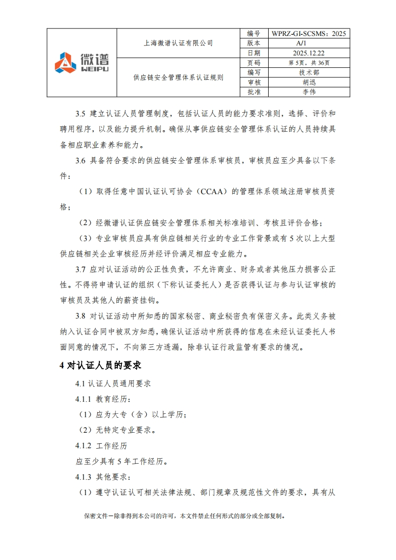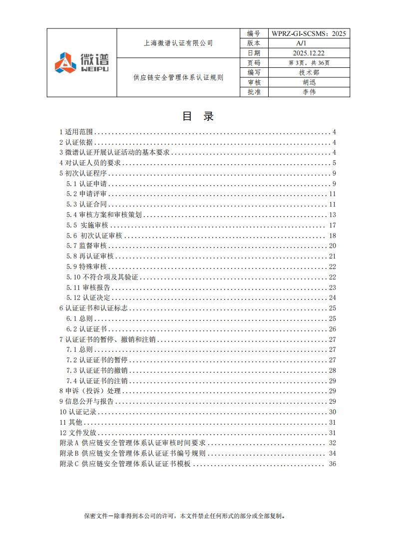 编号WPRZ-GI-SCSMS:2025上海微谱认证有限公司版本A/12025.12.22A微谱日期页码第1页,共36页WEIPU编写供应链安全管理体系认证规则技术部审核胡迅批准李伟供应链安全管理体系认证规则文件编号:WPRZ-GI-SCSMS:2025版本号:A/1编写人:技术部审核人:地批准人:本南批准日期:2025.12.22注:本规则自批准之日起生效:本规则附录可以单独修订和发布。保密文件一除非得到本公司的许可,本文件禁止任何形式的部分或全部复制。