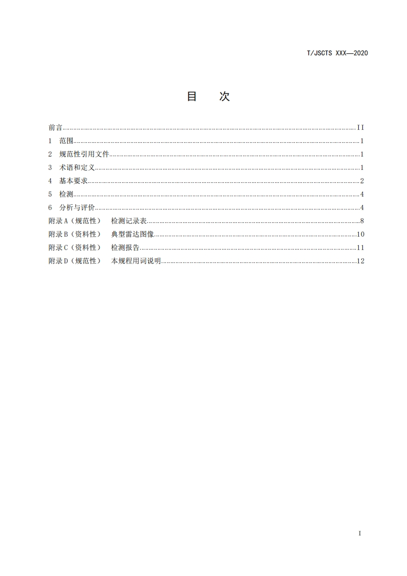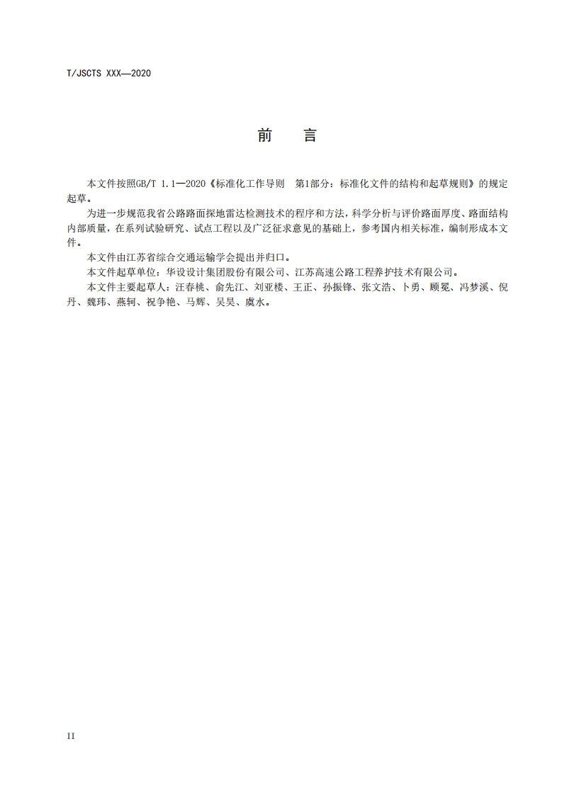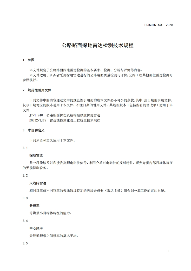 1C593.080.01CCS P 66团体标准T/JSCTS X××-2021公路路面探地雷达检测技术规程Inspection technical regulations of ground penetrating radar for hi ghwaypavement(征求意见稿)在提交反馈意见时,请将您知道的相关专利连同支持性文件一并附上2021-××-××发布2021-××-××实施江苏省综合交通运输学会发布