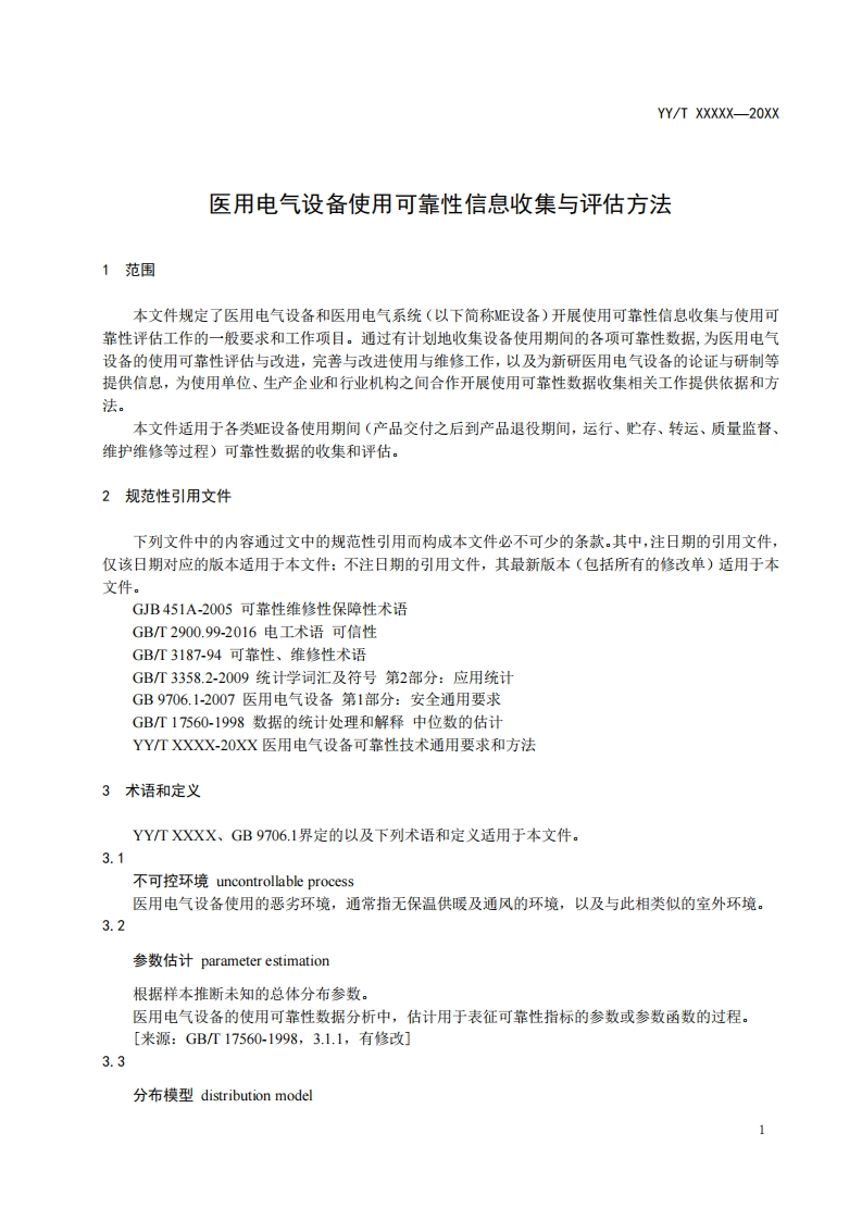 ICS点击此处添加中国标准文献分类号中华人民共和国医药行业标准YY/T XXXXX-20XX医用电气设备使用可靠性信息收集与评估方法Methods for collecting and evaluating the reliability information of medical electricalequipment(征求意见稿)2020.07.12XXXX-XX-XX发布XXXX-XX-X实施国家药品监督管理局发布