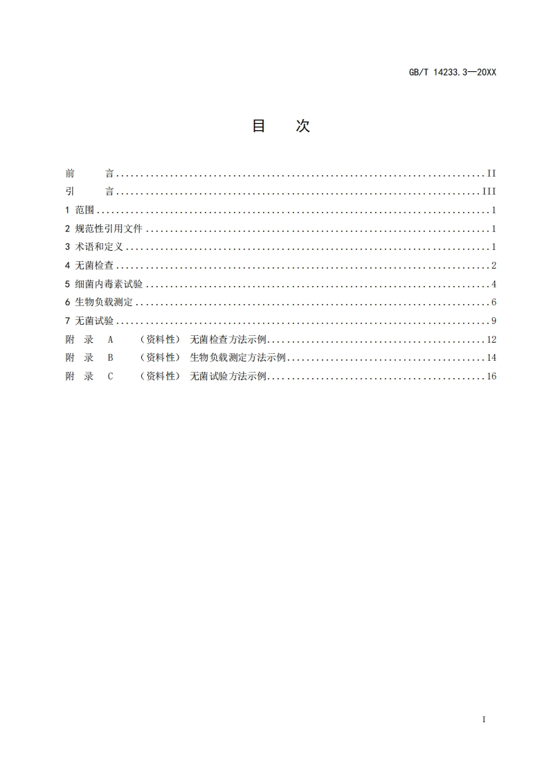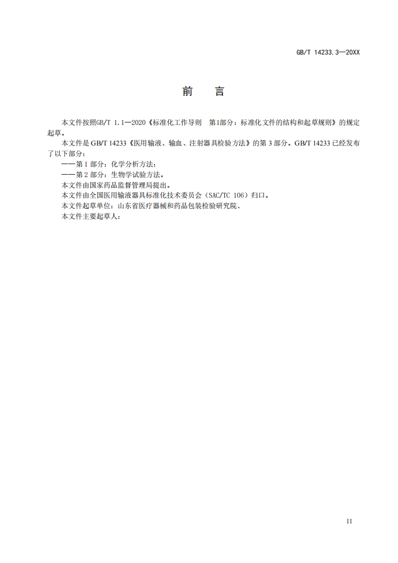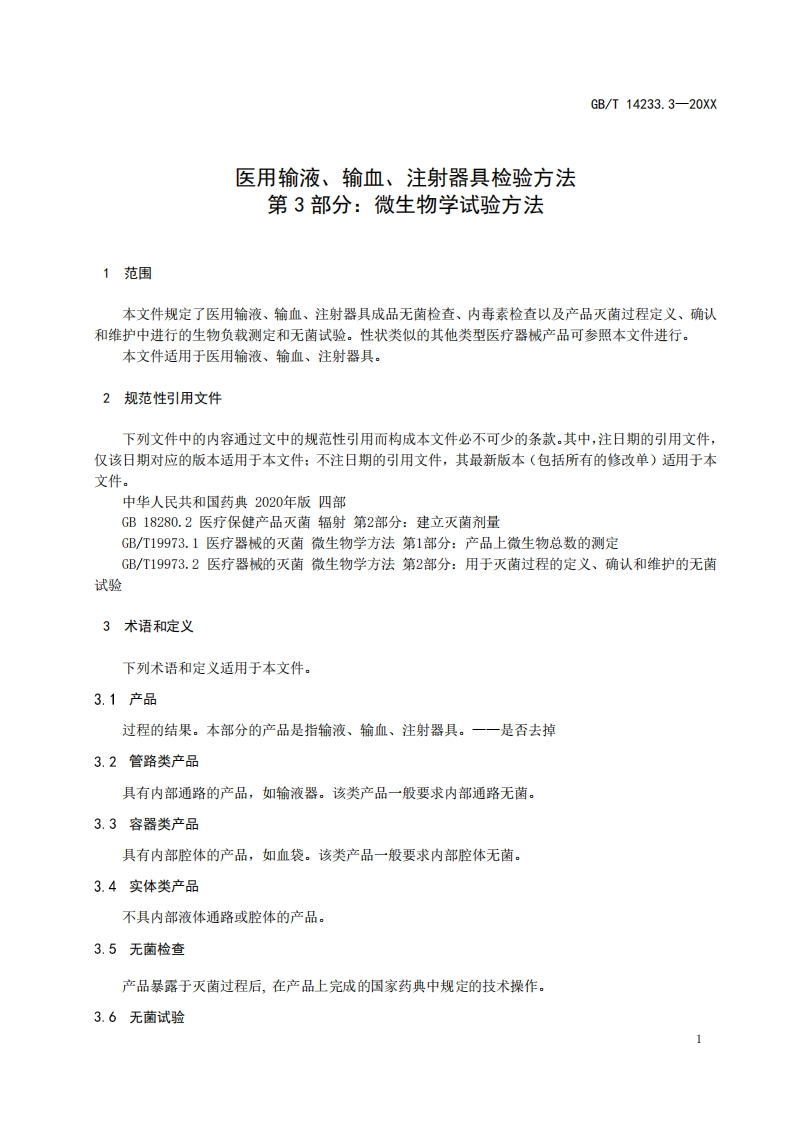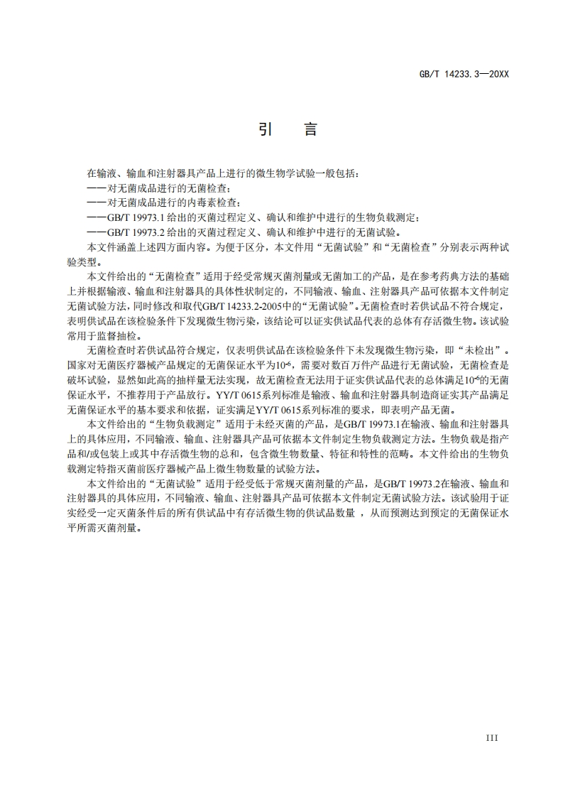 ICS11.040.20CCS C.31GB中华人民共和国国家标准GB/T14233.3-20XX医用输液、输血、注射器具检验方法第3部分:微生物学试验方法Test methods for infusion,transfusion,injection equipment for medical use-Part 3:Microbiological test methods(点击此处添加与国际标准一致性程度的标识)(工作组讨论稿)20XX-Xx-XX发布20XX-Xx-X实施国家市场监督管理登局发布国家标准化管理委员会