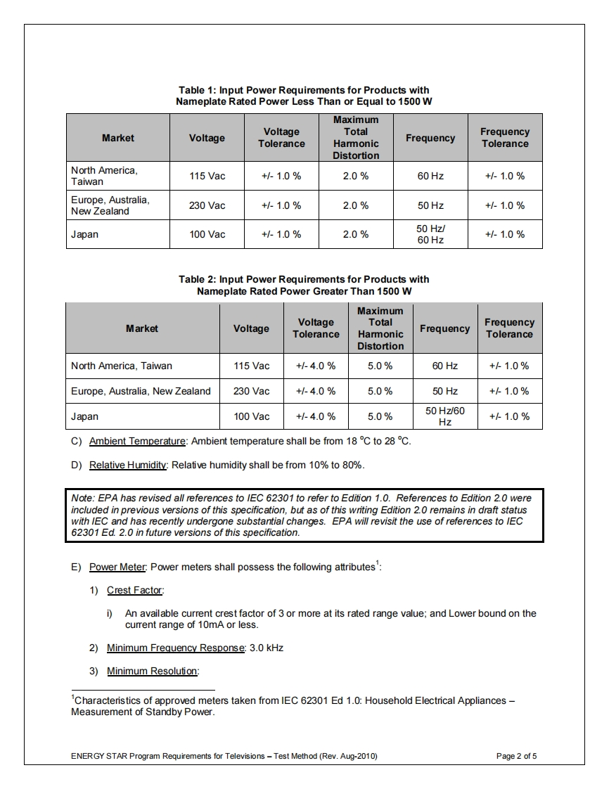 ENERGY STAR Program RequirementsProduct Specification for TelevisionsTest MethodENERGY STAR1 OVERVIEWThe following test method shall be used for determining product compliance with requirements in theENERGY STAR Eligibility Criteria for Televisions.2 APPLICABILITYENERGY STAR test requirements are dependent upon the feature set of the product under evaluation.The following guidelines shall be used to determine the applicability of each section of this document:1)Test procedures in section 6 shall be performed on all products;2)Test procedures in section 6.3 shall be performed on products without automatic brightnesscontrol (ABC)enabled by default;3)Test procedures in section 6.4 shall be performed on products with ABC enabled by default;4)Test procedures in section 6.5 shall be performed on products with download acquisition mode(DAM).3 DEFINITIONSUnless otherwise specified,all terms used in this document are consistent with the definitions in theENERGY STAR Eligibility Criteria for Televisions.4 TEST SETUPA)Test Setup and Instrumentation:Test setup and instrumentation for all portions of this procedure shallbe in accordance with the requirements of IEC 62301,Ed.1.0,"Measurement of Household ApplianceStandby Power",Section 4,"General Conditions for Measurements",unless otherwise noted in thisdocument.In the event of conflicting requirements,the ENERGY STAR test method shall takeprecedence.B)Input Power:Input power shall be as specified in Table 1 or Table 2.ENERGY STAR Program Requirements for Televisions-Test Method(Rev.Aug-2010)Page 1 of 5