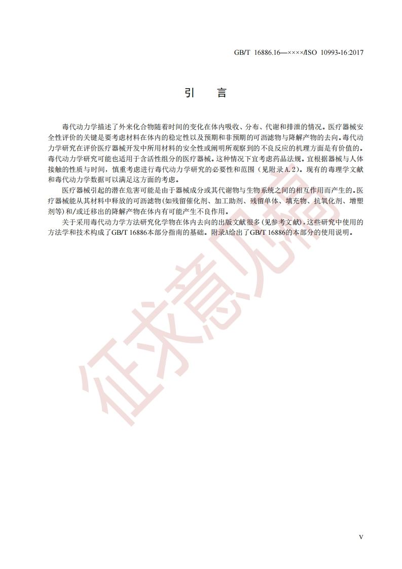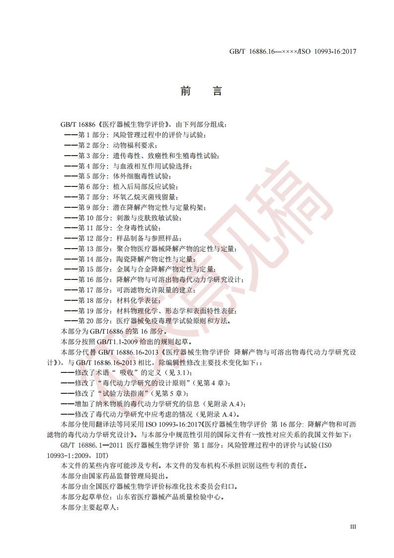 ICS11.100.20C30GB中华人民共和国国家标准GB/T16886.16-××××IS010993-16:2017代替GB/T16886.16-2013医疗器械生物学评价第16部分:降解产物与可沥滤物毒代动力学研究设计Biological evaluation of medical devices-Part 16:Toxicokinetic study design for degradation products and leachables(IS010993-16:2017,IDT)(征求意见稿)(2019-06-30)在提交反馈意见时,请将你所知道的相关专利连同支持性文件一并附上。××X×-X×-××发布××××-××-××实施中华人民共和国市场监督管理总局发布中国国家标准化管理委员会