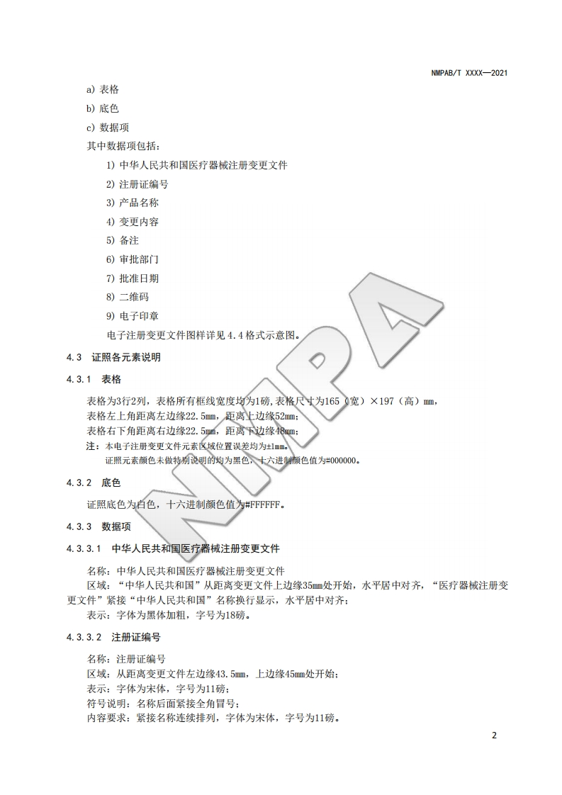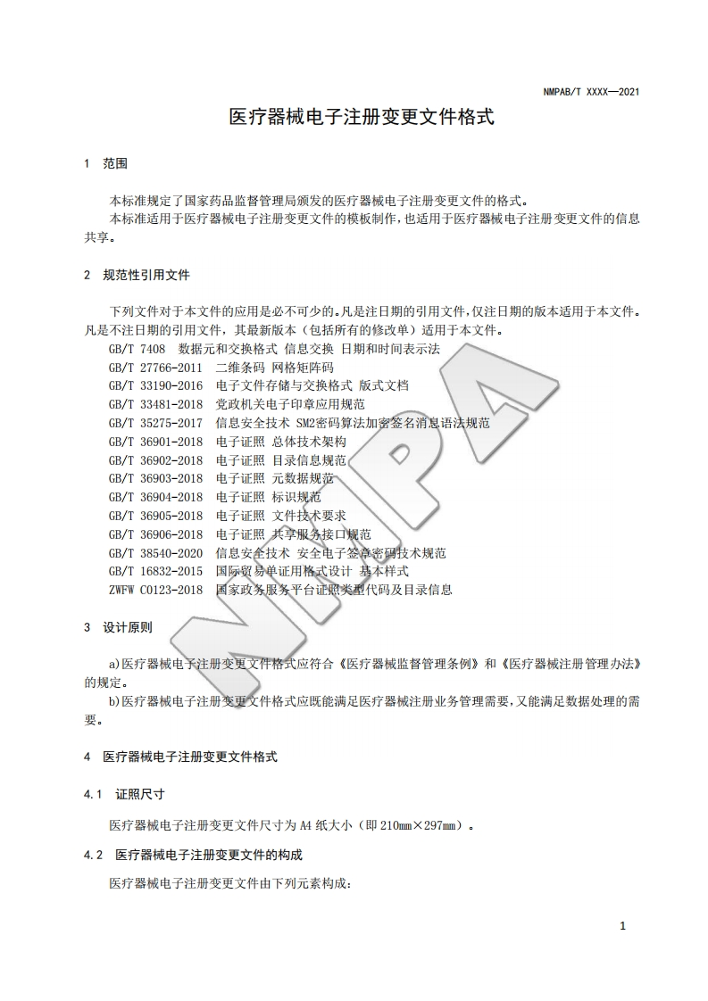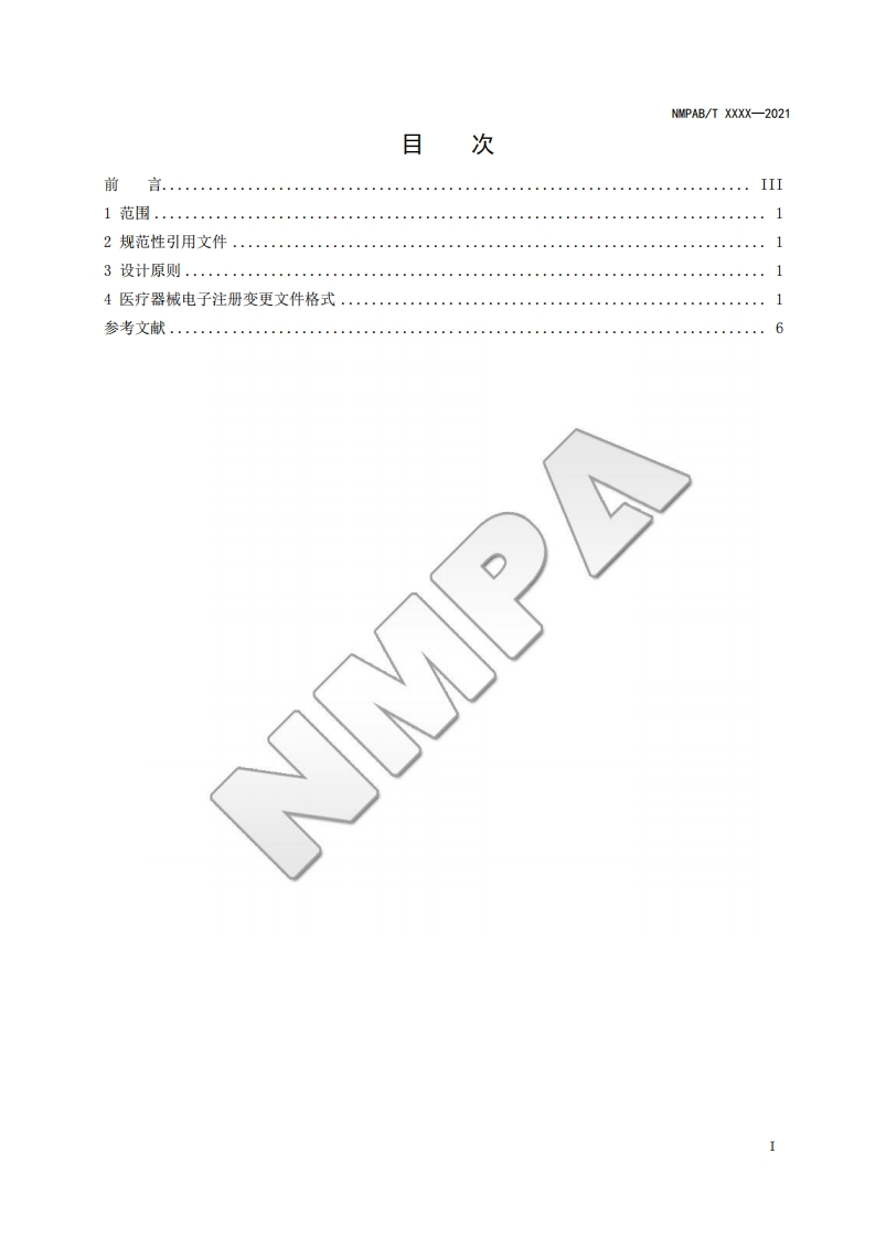 医疗器械电子注册变更文件格式Formsforelectroniccertificateofmedicaldeyiceregistrationchangedocument口348072@abc昨天发布关注私信0.62MB9页028医疗器械电子注册变更文件格式Formsforelectroniccertificateofmedicaldeyiceregistrationchangedocument口此内容为付费资源,请付费后查看¥19¥23黄金会员免费钻石会员免费立即购买您当前未登录!建议登陆后购买,可保存购买订单付费资源 第1页 / 共9页 第2页 / 共9页 第3页 / 共9页 第4页 / 共9页 第5页 / 共9页 试读已结束,还剩4页,您可下载完整版后进行离线阅读 THE END标准规范 文本预览 NMPAB国家药品监督管理局信息化标准NMPAB/T xxxx-2021医疗器械电子注册变更文件格式Forms for electronic certificate of medical device registration change document(征求意见稿)2021-XX-XX发布2021-XX-XX实施国家药品监督管理局发布 查看更多 收起部分 喜欢就支持一下吧收藏