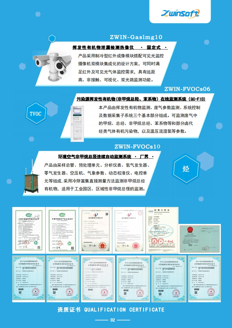 之uinsof2VDC系利产涵ZWIN-PVOCO6挥发性有机物(TVOC)在线监测系统·厂界·本产品以PID光离子化为原理测量空气中挥TVOC发性有机的浓度,可集成环境参数及声光报警器,为厂区环境空气质量监测提供实时、有效数据。ZWIN-PVOCO6挥发性有机物(TV0C)在线监测系统·固定源:本产品以PD光离子化为原理,采用泵吸式采样苯发性有机物方式,装配疏水器、除湿器、流量计等预处理单元进行干燥过滤,检测烟道中的挥发性有机物浓度。ZWIN-PVOCO6挥发性有机物(①V0G)在线监测系统·防燥式·本产品加装防爆外箱,应用于恶劣环境下的气体监测仪,安装方式可以采用立杆及壁挂方VOCs式,整体具备防水、防油、防腐蚀特性。·EXZWIN-GasMan06便携式挥发性有机物检测仪·便携式·本产品是一款手持式挥发性有机化合物(V0Cs)气体检测仪,采用光离子化检测器(PID),选择无线传输模块可以实现与控制台的无线数据传输和远程监控。ZWIN-Gaslmg06挥发性有机物泄检测热像仪·便携式本产品是一种高性价比工具型红外成像检漏仪,采用PID制冷型中波红外探测器,具有极小的热灵敏度,适用于开放大气空间的泄漏检测。01