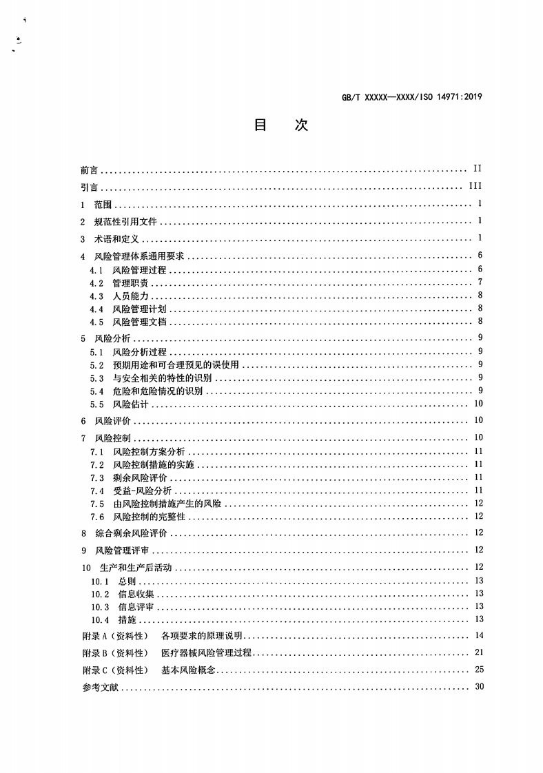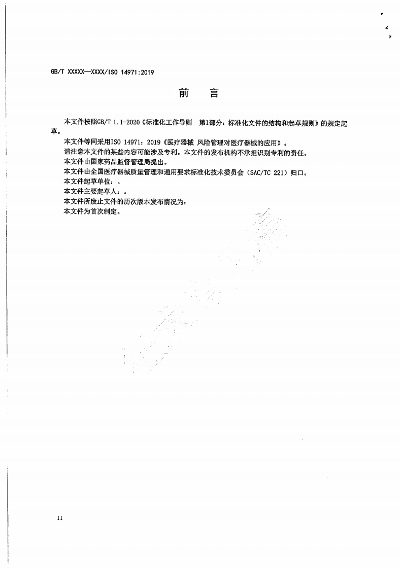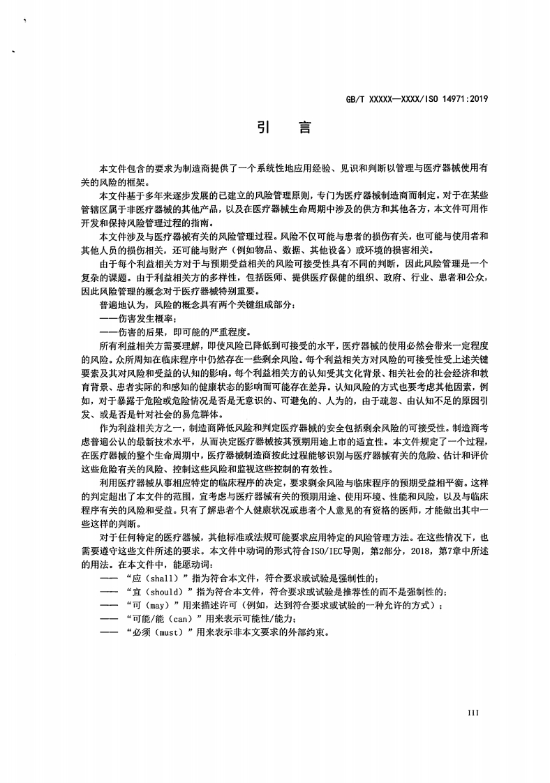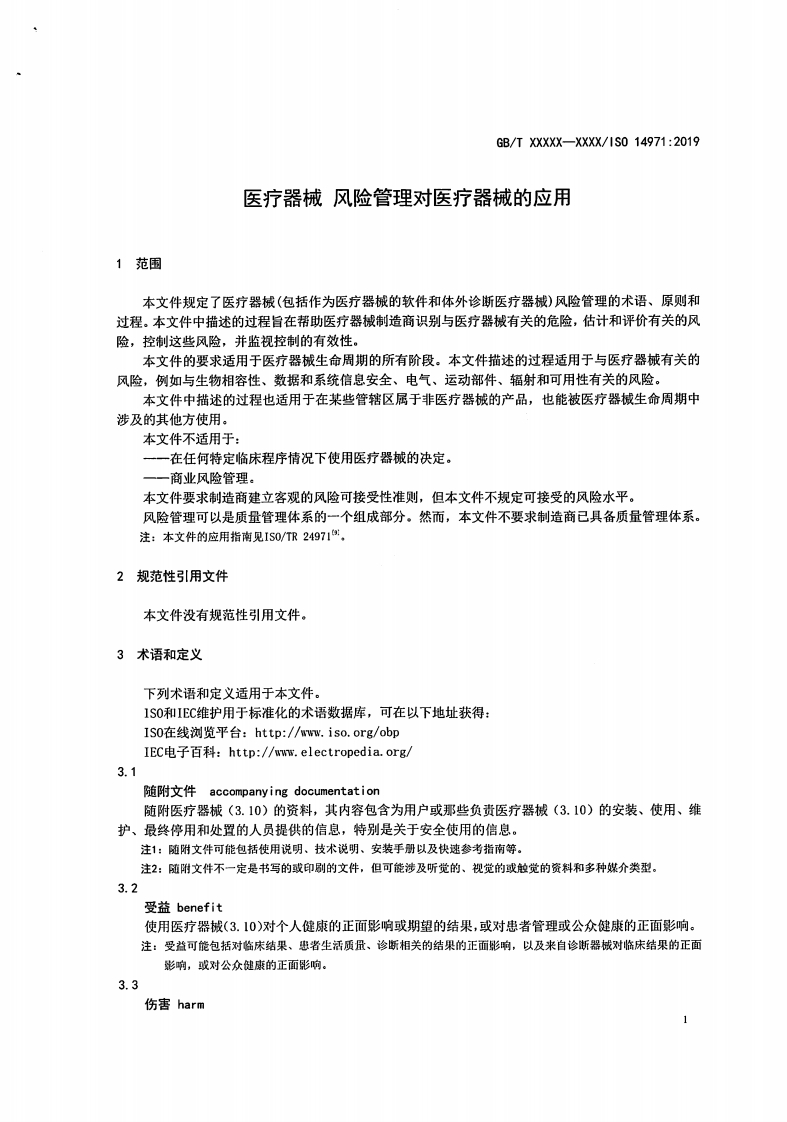 ICs11.040.01CCS c 30中华人民共和国国家标准GB/T XXXXX-XXXX/IS0 14971:2019医疗器械风险管理对医疗器械的应用Medical devices-Application of risk management to medical devices(1S014971:2019,DT)(征求意见稿)(本草案完成时间:2021年06月01日)在提交反馈意见时,请将您知道的相关专利连同支持性文件一并附上。XXXX-XX-XX发布XXXx-Xx-Xx实施国家市场监督管理总局发布国家标准化管理委员会