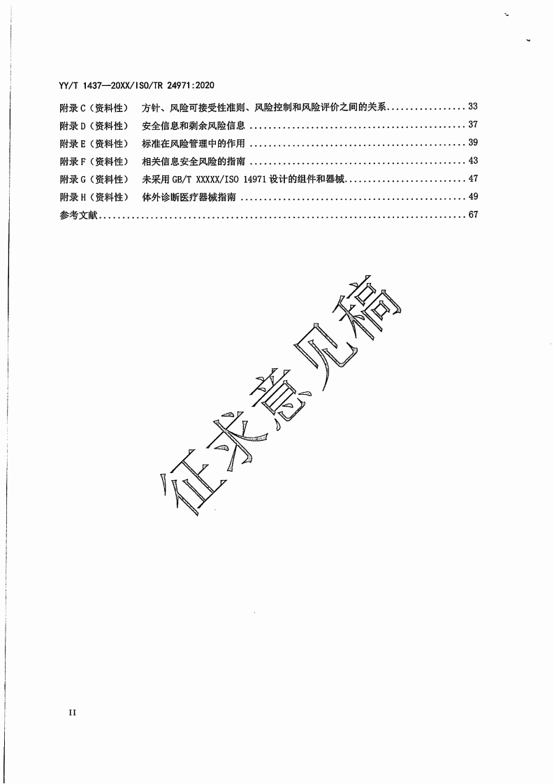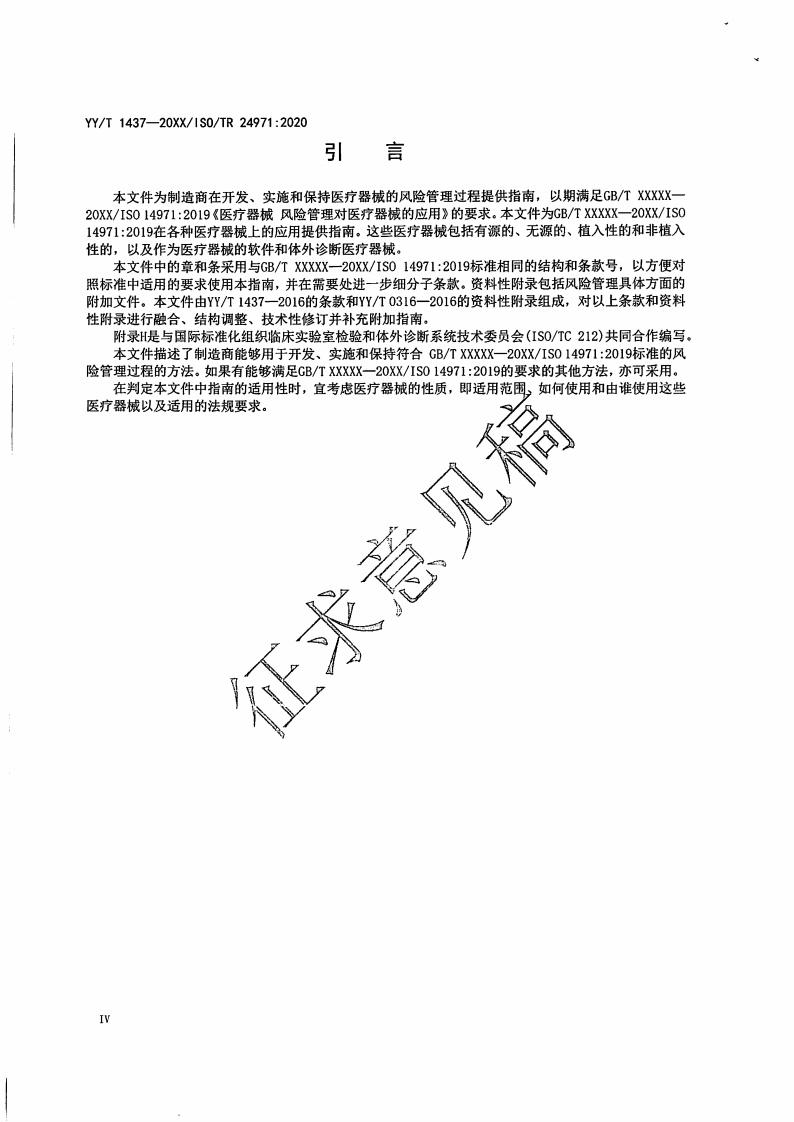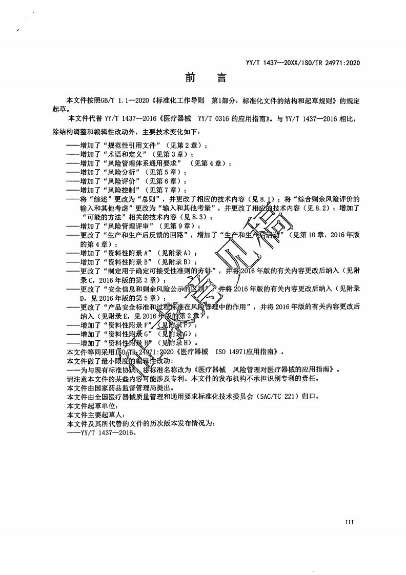 ICS11.040.01CCS C 30YY中华人民共和国医药行业标准YY/T1437-20XX/1S0/TR24971:2020代替YW/T1437-2016医疗器械风险管理对医疗器織的应用指南Medical devices-Guidance on the application ofrisk management to medical(ISO/TR 24971:2020,Medieal devicesGuidance on the application of ISO 14971,IDT)(征求意见稿)本草案完成时间:2021-08-02)在提交反馈意见时,请将您知道的相关专利连同支持性文件一并附上XXXX-x-XX发布XXXX-XX-X实施国家药品监督管理局发布