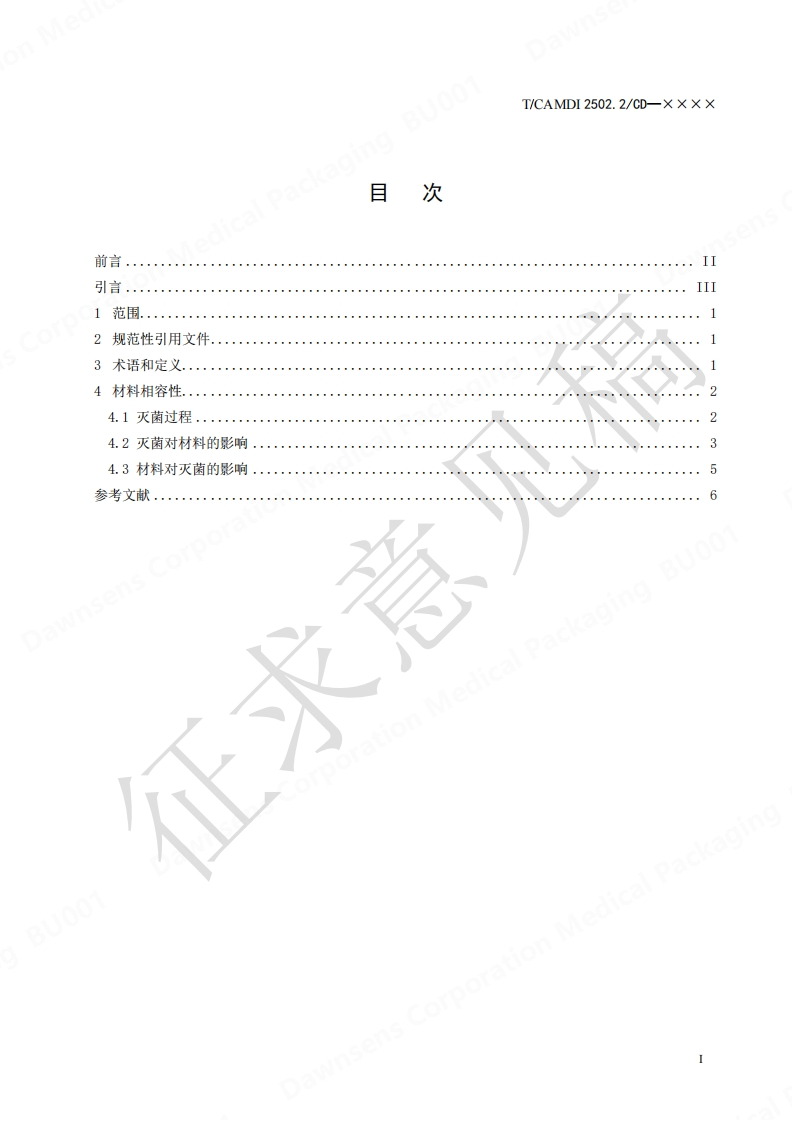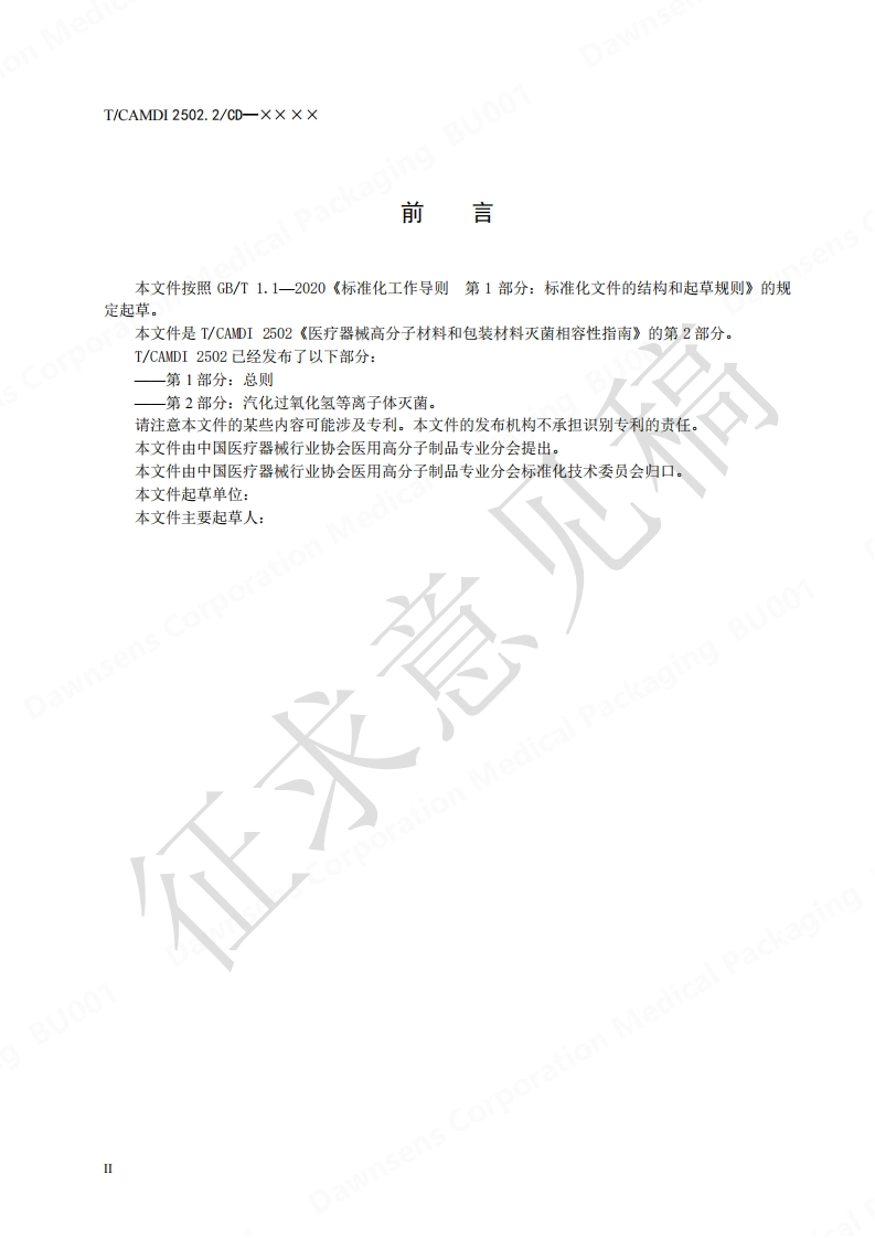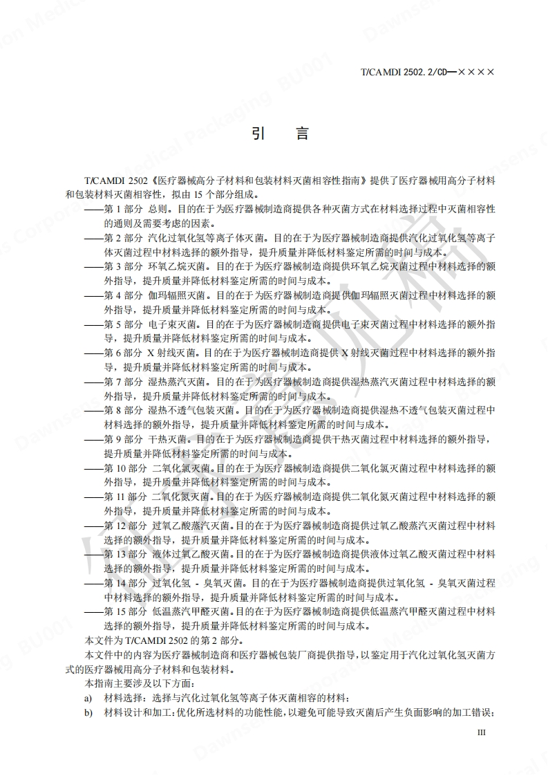 ICS11.040.20CCS C 31中国医疗器械行业协会China Association for Medical Devices Industry团体标准T/CAMDI2502.2/CD-×××X医疗器械高分子材料和包装材料灭菌相容性指南第2部分:汽化过氧化氢等离子体灭菌Guidance on Sterilization Compatibility of Polymer and Packaging Materials forMedical Devices-Part 2:Hydrogen peroxide sterilization(征求意见稿CD)在提交反馈意见时,请将您知道的相关专利连同支持性文件一并附上。××X×-X×-××发布××××-××-××实施中国医疗器械行业协会发布