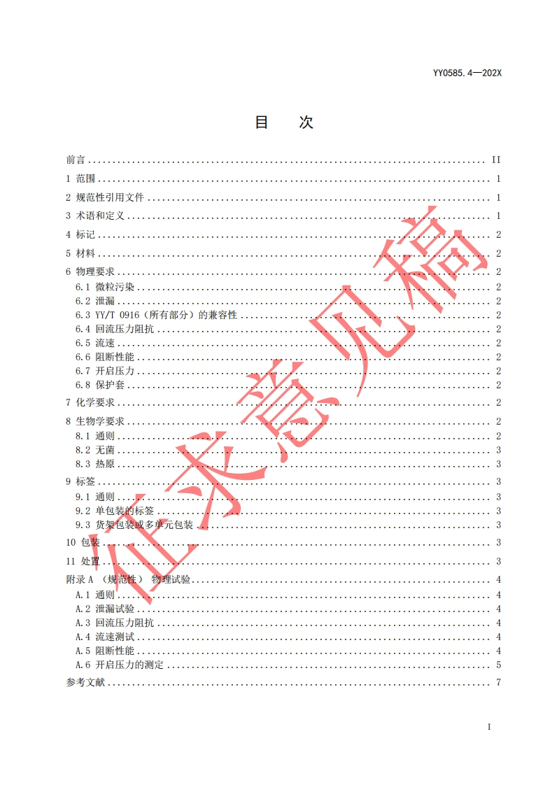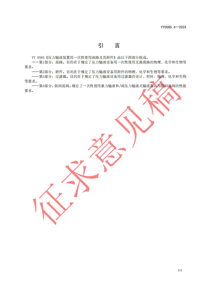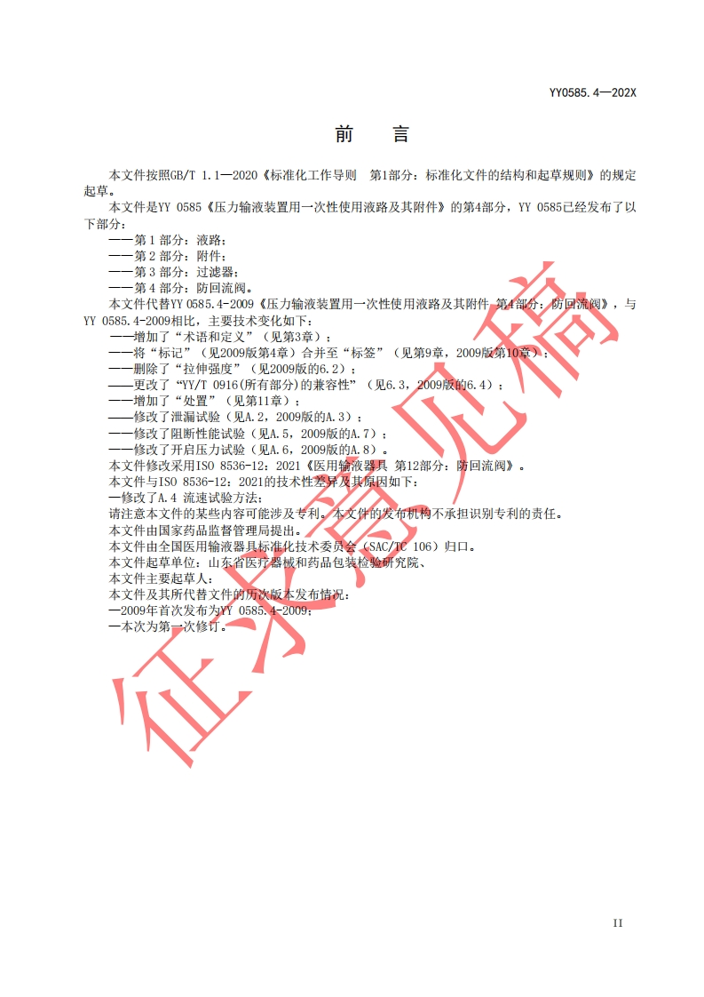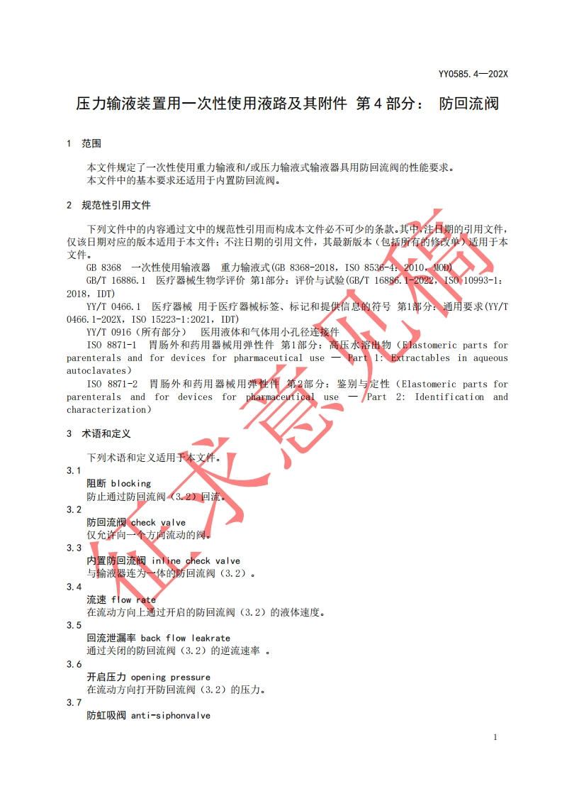 ICS11.040.20CCS 31YY中华人民共和国医药行业标准YY0585.4-202X代替YY0585.4-2009压力输液装置用一次性使用液路及其附件第4部分:防回流阀Fluid lines for use with pressure infusion equipment and accessories for single usePart4:Cheek valves(ISO 8536-12:2021 Infusion equipment for medical use Part12:Check valves forsingle use,MOD)2022.8.30征求意见稿在提交反债意见时,请将您知道的相关专利连同支持性文件一并附上。建议本标准自发布之日起24个月实施。XXXX-XX-Xx发布20XX-XX-XX实施国家药品监督管理局发布