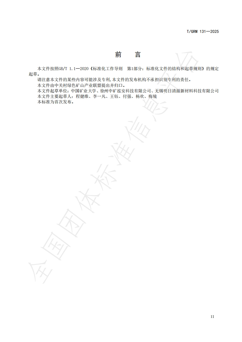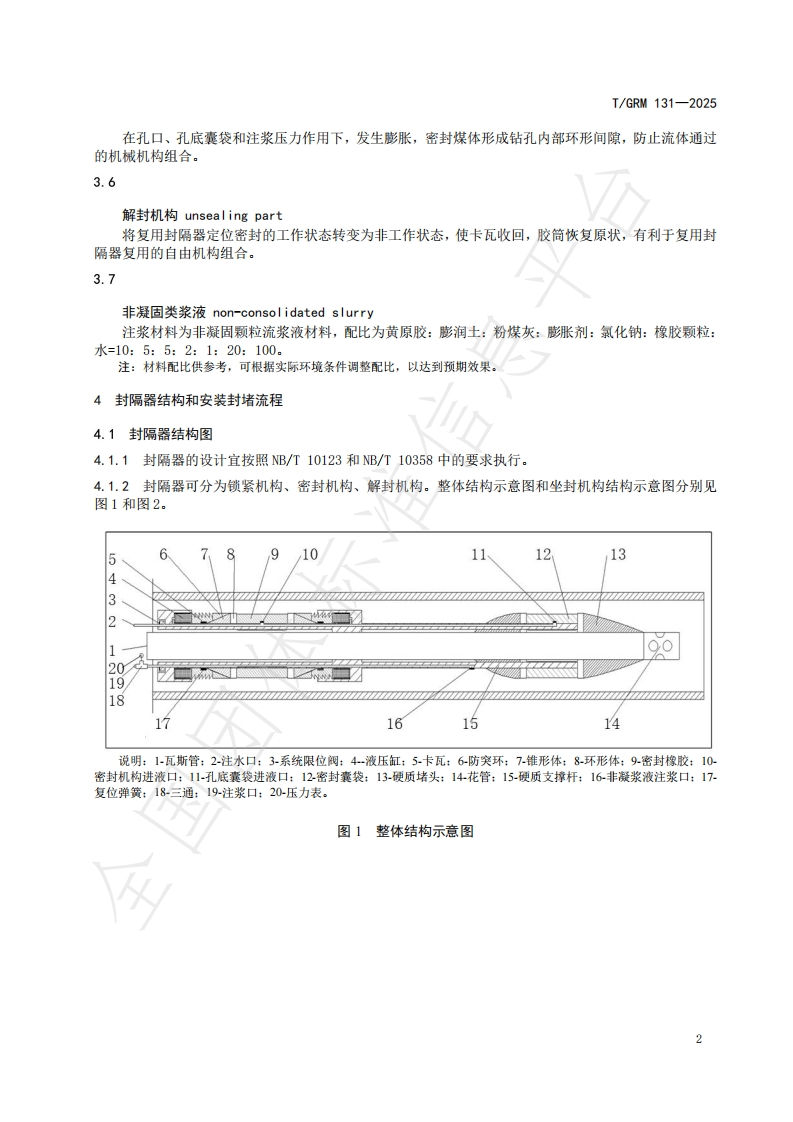 ICS73.040CCS B1110I/GRM中关村绿色矿山产业联盟团体标准T/GRM131—2025可复用式瓦斯钻孔两堵一注一体式坐封封隔器应用技术要求Technical requirements for the application of reusable gas drillingtwo-block-one-injection integrated set-and-seal packer国团2025-08-11发布2025-08-11实施中关村绿色矿山产业联盟发布