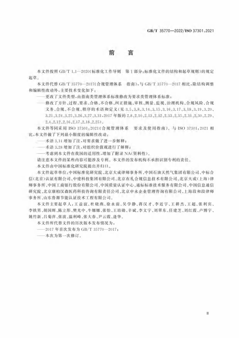 1Cs03.100.01CCS A 02B中华人民共和国国家标准GB/T35770-2022/1S037301:2021代替GB/T35770一2017合规管理体系要求及使用指南Compliance management systems-Requirements with guidance for use(IS037301:2021,IDT)2022-10-12发布2022-10-12实施国家市场监督管理总局国家标准化管理委员会发布