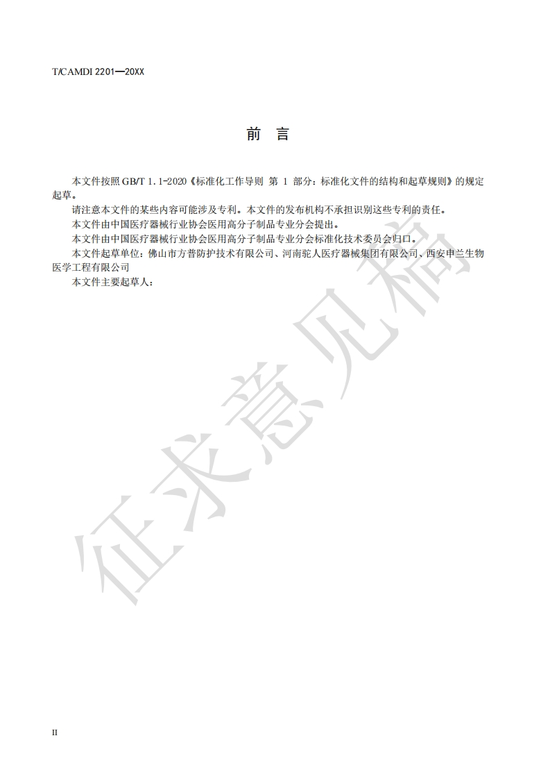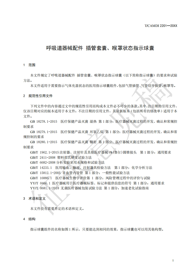 ICS11.040.20CCS C31中国医疗器械行业协会China Association for Medical Devices Industry团体标准T/CAMDI 2201/CD-20XX呼吸道器械配件插管套囊、喉罩状态指示球囊Respiratory equipment accessories,Intubation bag,Laryngeal mask state pilot balloon(征求意见稿CD)在提交反馈意见时,请将您知道的相关专利连同支持性文件一并附上。20Xx-X-X发布20XX-XX-XX实施中国医疗器械行业协会发布