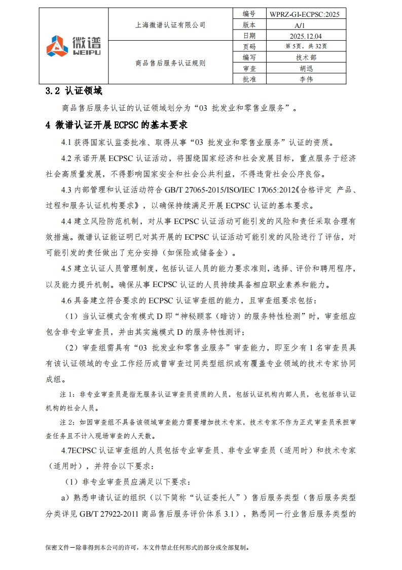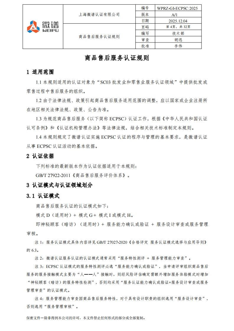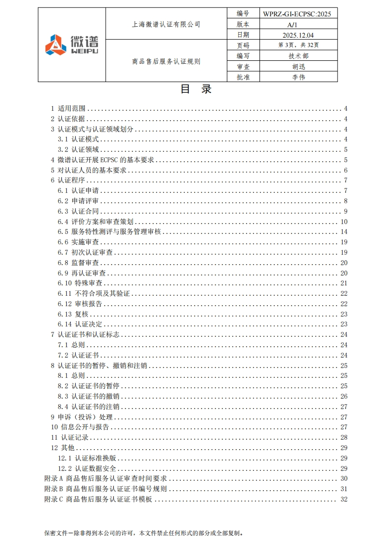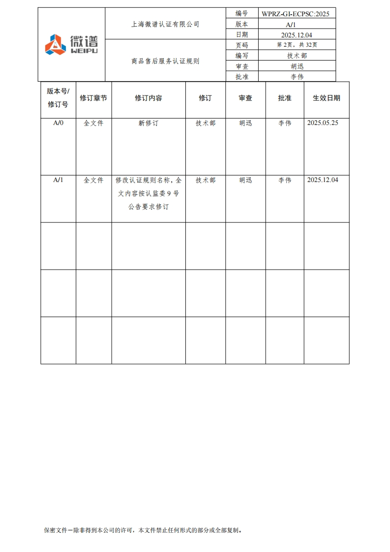 编号WPRZ-GI-ECPSC:2025上海微谱认证有限公司版本A/1日期2025.12.04A微谱页码第1页,共32页WEIPU编写技术部商品售后服务认证规则审查胡迅批准李伟商品售后服务认证规则文件编号:WPRZ-GI-ECPSC:2025版本号:A/1编写人:技术部审查人:七地批准人:南批准日期:2025-12-04注:本文件自批准之日起生效:本文件附录可以单独修订和发布。修订页保密文件一除非得到本公司的许可,本文件禁止任何形式的部分或全部复制。