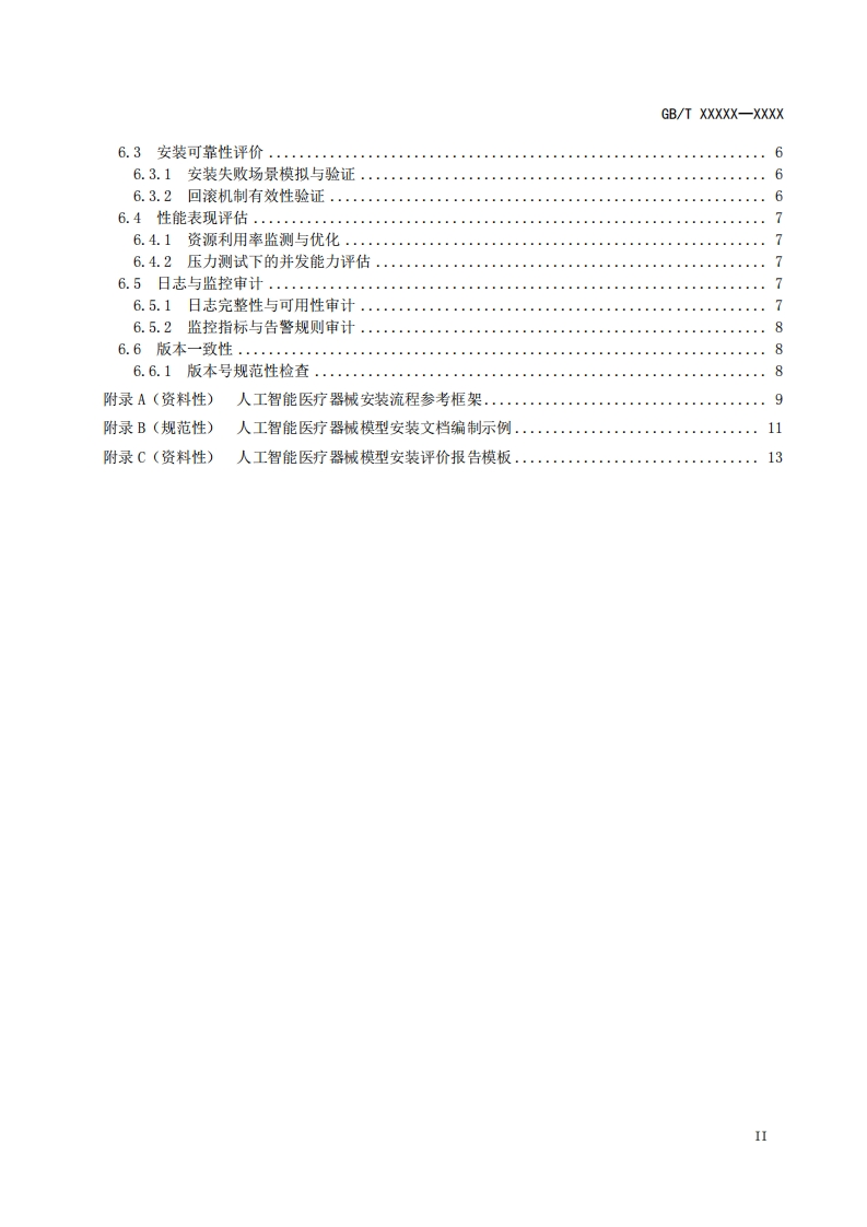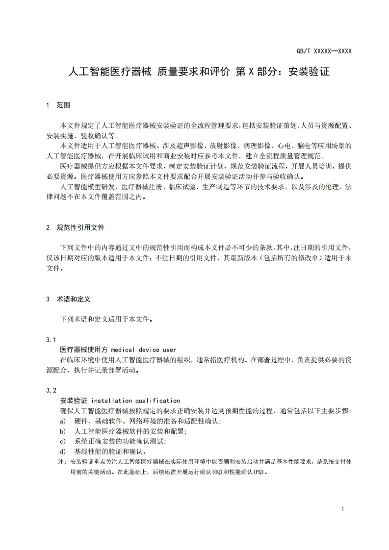 ICS点击此处添加ICS号CCS点击此处添加CCS号GB中华人民共和国国家标准GB/T XXXXX-XXXX人工智能医疗器械质量要求和评价第X部分:安装验证Artificial Intelligence Medical Devices-Quality Requirements and Evaluation-PartX Installation Qulification(点击此处添加与国际标准一致性程度的标识)草案版次选择在提交反馈意见时,请将您知道的相关专利连同支持性文件一并附上。XXXX-Xx-XX发布XXXX-x-X实施国家市场监督管理总局发布国家标准化管理委员会