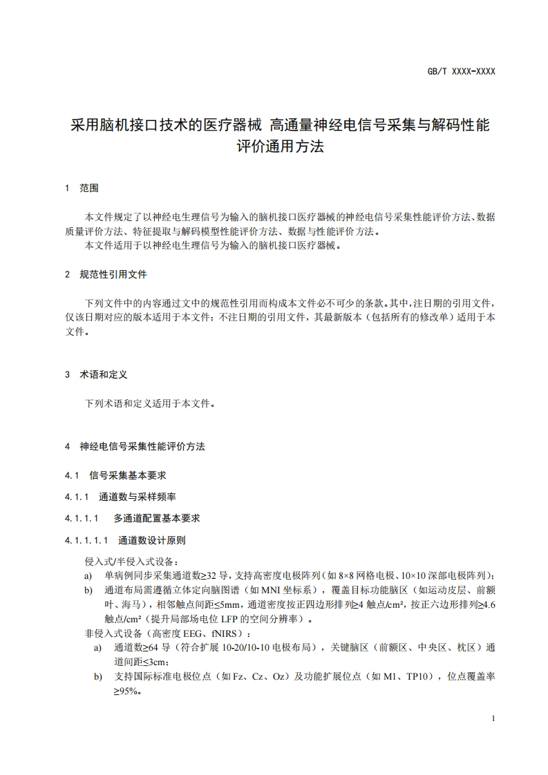 1CS11.040.40CCS C30中华人民共和国国家标准GB/T XXXX-XXXX采用脑机接口技术的医疗器械神经电信号采集与解码性能评价通用方法(Medical device us ing brain-computer interface technology -GeneralEvaluation Method for the Performance of Neural Signal Acquisition andDecoding标准草案稿20XX-XX-Xx发布20XX-XX-XX实施家市场监督管理总局家标准化管理委员会发布