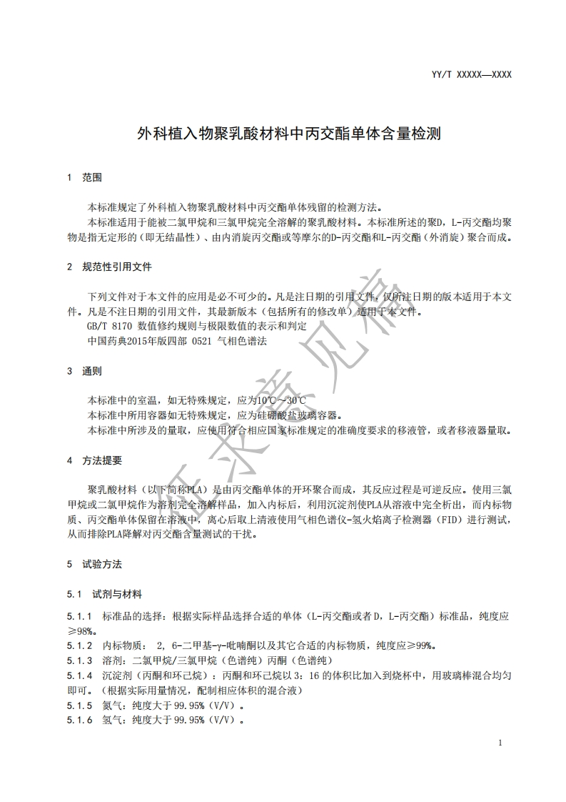 1CS11.040.40035中华人民共和国医药行业标准YY/T XXXXX-XXXX外科植入物聚乳酸材料中丙交酯单体含量检测Determination of lactide monomer residual in Poly (lactide)for Surgical implant征求征求意见稿)在提交反馈意见时,请将您知道的相关专利连同支持性文件一并附上。XXXX-XX-XX发布XXXX-XX-XX实施国家药品监督管理局发布