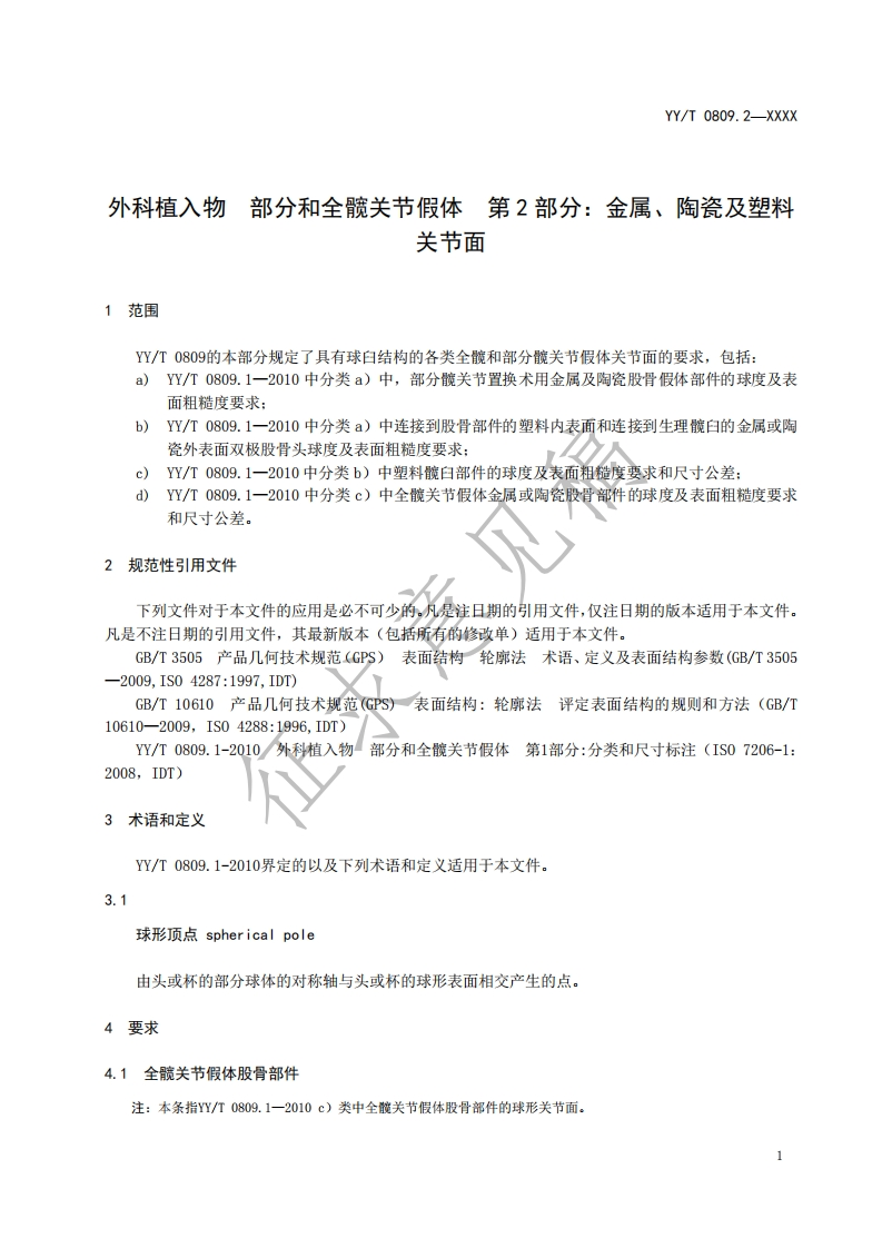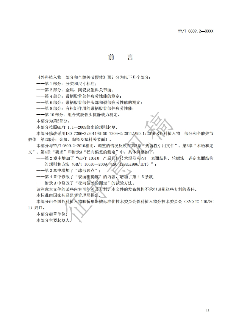 1CS11.040.40C35中华人民共和国医药行业标准YY/T 0809.2-XXXX代替YY/T0809.2-2010外科植入物部分和全髋关节假体第2部分:金属、陶瓷及塑料关节面Implants for surgery-Partial and total hip joint prosthesesPart 2:Articulatingsurfaces made of metallic,ceramic and plastics materials(IS07206-2:2016,M0D)(征求意见稿)在提交反馈意见时,请将您知道的相关专利连同支持性文件一并附上。XXXX-XX-XX发布XXXX-XX-XX实施国家药品监督管理局发布