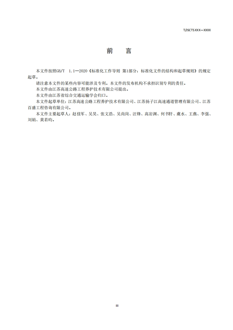 大流量高速公路集中养护技术指南TechnicalGuidelinesforcentralizedmaintenanceofhigh-flowexpressway求意见稿)征348072@abc昨天发布关注私信1.88MB48页036大流量高速公路集中养护技术指南TechnicalGuidelinesforcentralizedmaintenanceofhigh-flowexpressway求意见稿)征此内容为付费资源,请付费后查看¥19¥23黄金会员免费钻石会员免费立即购买您当前未登录!建议登陆后购买,可保存购买订单付费资源 第1页 / 共48页 第2页 / 共48页 第3页 / 共48页 第4页 / 共48页 第5页 / 共48页 试读已结束,还剩43页,您可下载完整版后进行离线阅读 THE END标准规范 文本预览 10s93.080.01CCS R18团体标准T/JSCTS×XX一XXXX大流量高速公路集中养护技术指南Technical Guidelines for centralized maintenance of high-flow expressway(征求意见稿)在提交反馈意见时,请将您知道的相关专利连同支持性文件一并附上。×X×X-××-X×发布××××-×X-××实施江苏省综合交通运输学会发布 查看更多 收起部分 喜欢就支持一下吧收藏