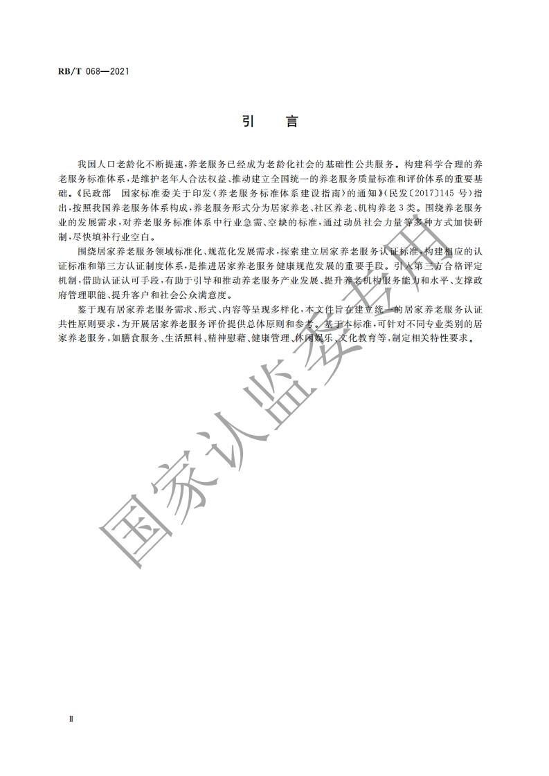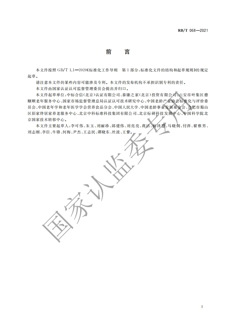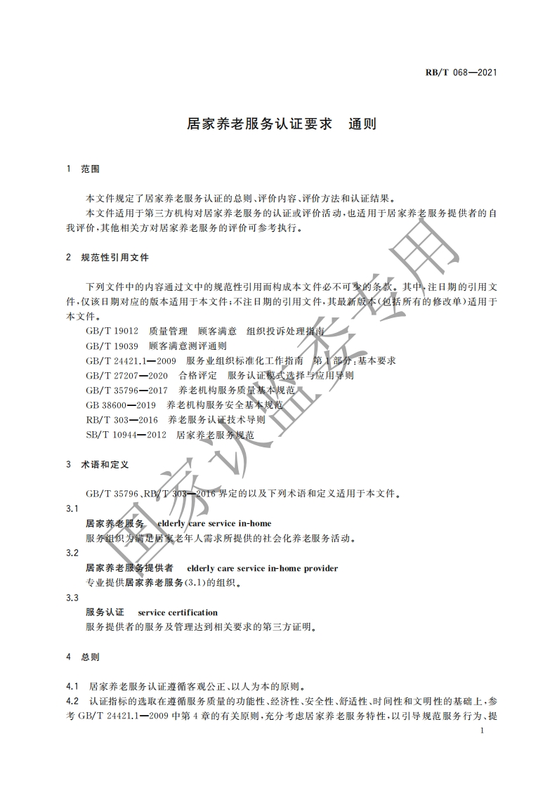 居家养老服务认证要求一通则Elderlycareservicein-homecertificationrequirements-General家348072@abc昨天发布关注私信0.62MB9页027居家养老服务认证要求一通则Elderlycareservicein-homecertificationrequirements-General家此内容为付费资源,请付费后查看¥19¥23黄金会员免费钻石会员免费立即购买您当前未登录!建议登陆后购买,可保存购买订单付费资源 第1页 / 共9页 第2页 / 共9页 第3页 / 共9页 第4页 / 共9页 第5页 / 共9页 试读已结束,还剩4页,您可下载完整版后进行离线阅读 THE END标准规范 文本预览 ICS03.120.00CCS A 00RB中华人民共和国认证认可行业标准RB/T068-2021居家养老服务认证要求一通则Elderly care service in-home certification requirements-General国家认2021-11-04发布2022-01-01实施国家认证认可监督管理委员会发布 查看更多 收起部分 喜欢就支持一下吧收藏