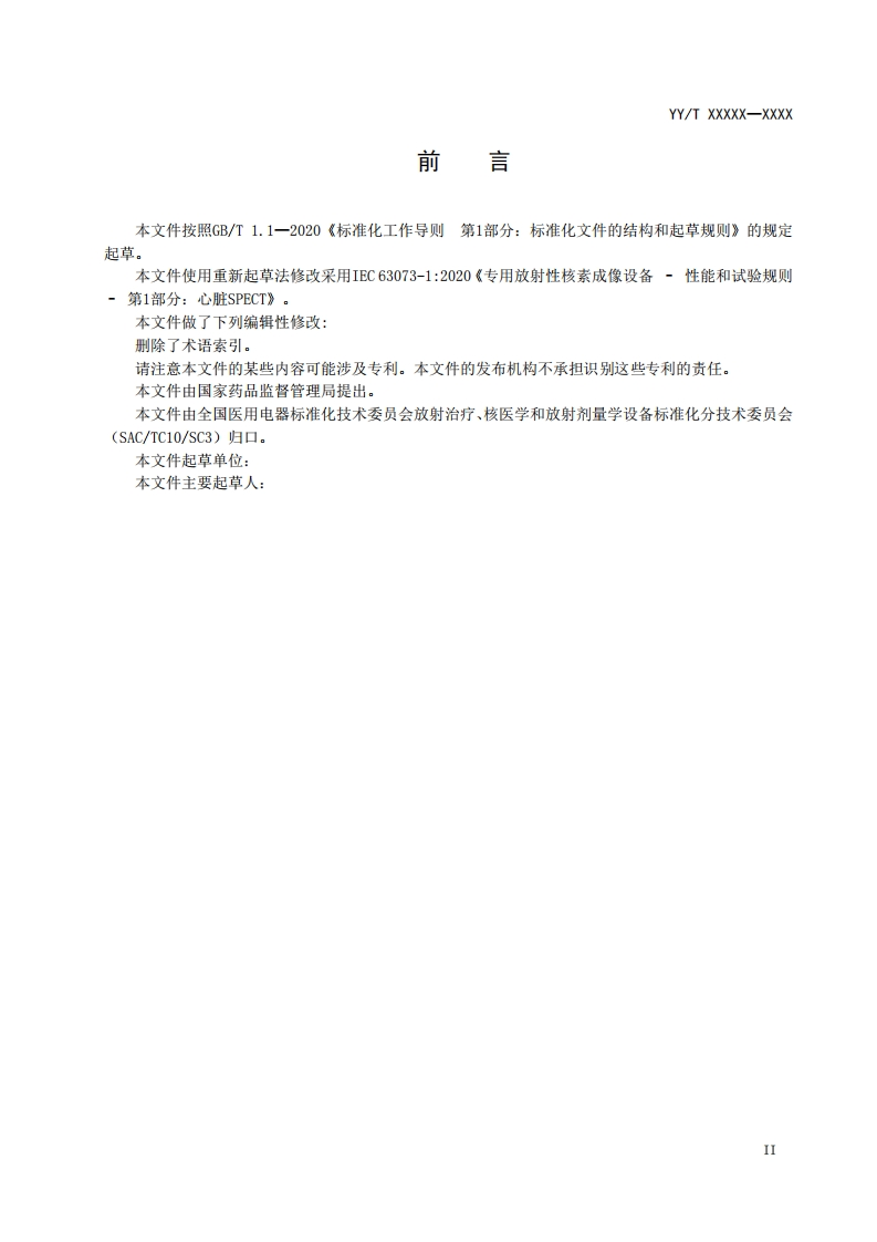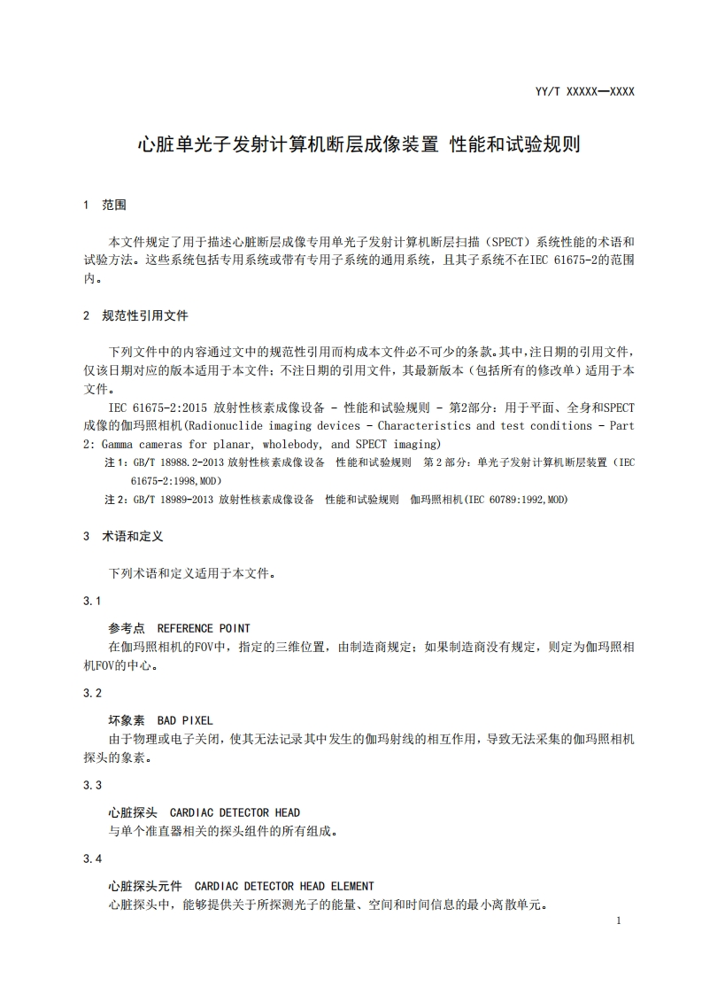 ICS11.040.50CCS C43YY中华人民共和国医药行业标准YY/T XXXXX-XXXX心脏单光子发射计算机断层成像装置性能和试验规则Characteristics and test conditions for Cardiac Single Photon Emission ComputedTomography Device(EC63073-1:2020,M0D)(征求意见稿)(本草案完成时间:2022.07)在提交反馈意见时,请将您知道的相关专利连同支持性文件一并附上。XXXX-Xx-XX发布XXXX-Xx-XX实施国家药品监督管理局发布