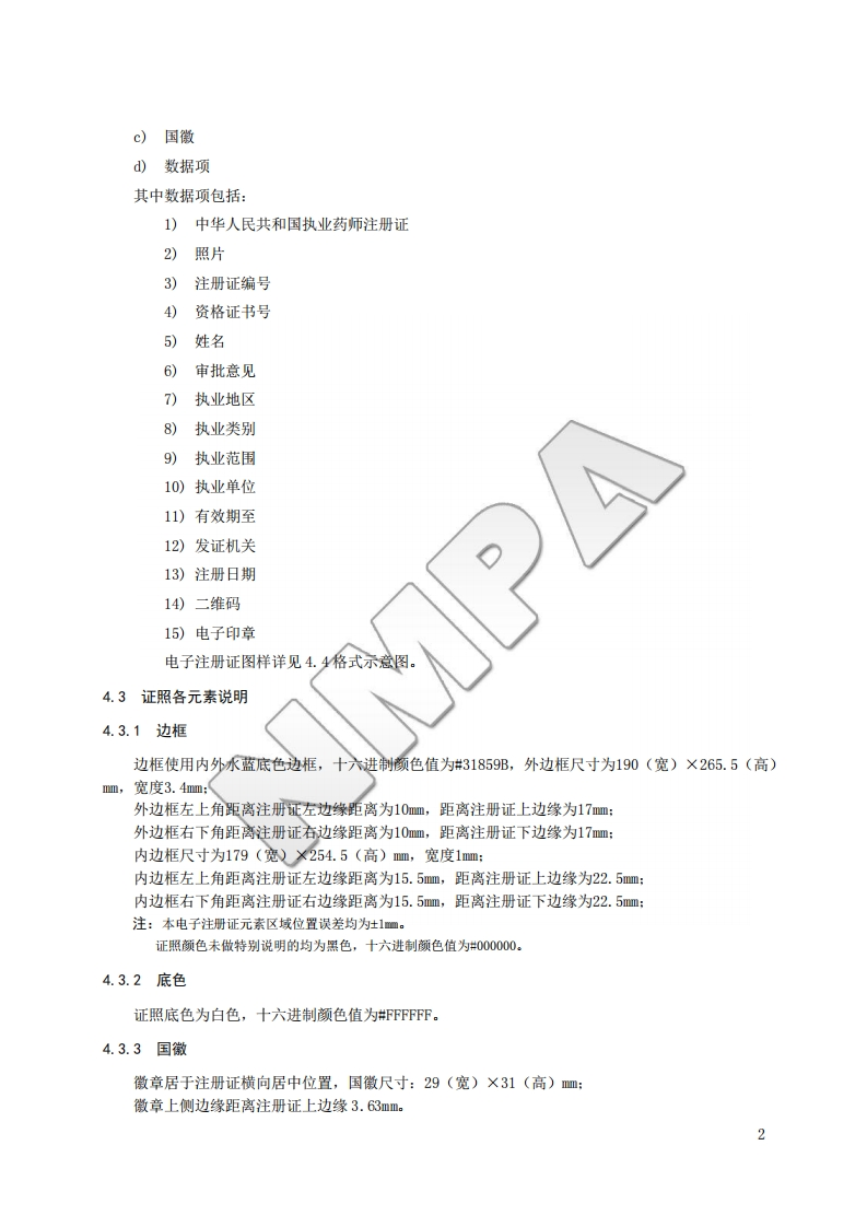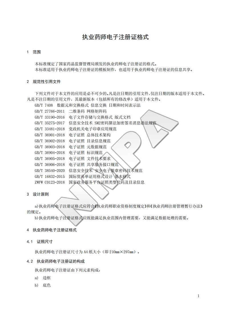 执业药师电子注册证格式Formsforlicensedphatmacistelectronicregistrationlicense意川毡348072@abc前天发布关注私信0.78MB10页029执业药师电子注册证格式Formsforlicensedphatmacistelectronicregistrationlicense意川毡此内容为付费资源,请付费后查看¥19¥23黄金会员免费钻石会员免费立即购买您当前未登录!建议登陆后购买,可保存购买订单付费资源 第1页 / 共10页 第2页 / 共10页 第3页 / 共10页 第4页 / 共10页 第5页 / 共10页 试读已结束,还剩5页,您可下载完整版后进行离线阅读 THE END标准规范 文本预览 NMPAB国家药品监督管理局信息化标准NMPAB/T xxxx-2021执业药师电子注册证格式Forms for licensed pharmacist electronic registration license(征求意见稿)2021-XX-XX发布2021-XX-XX实施国家药品监督管理局发布 查看更多 收起部分 喜欢就支持一下吧收藏