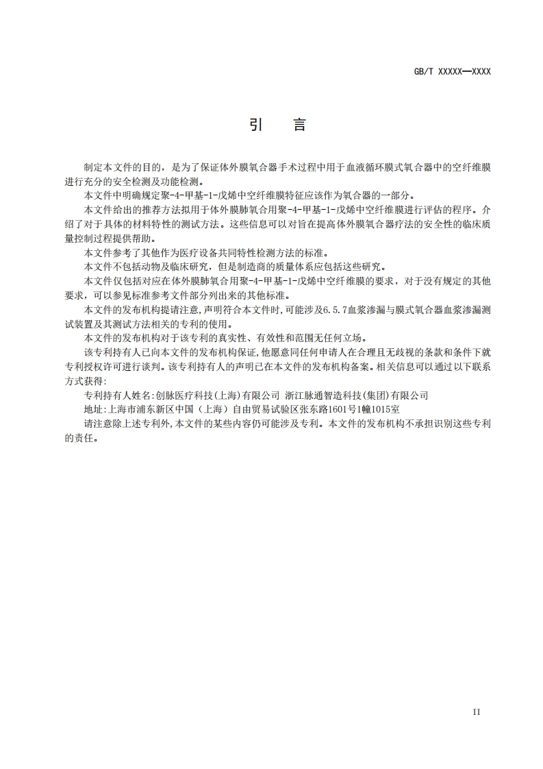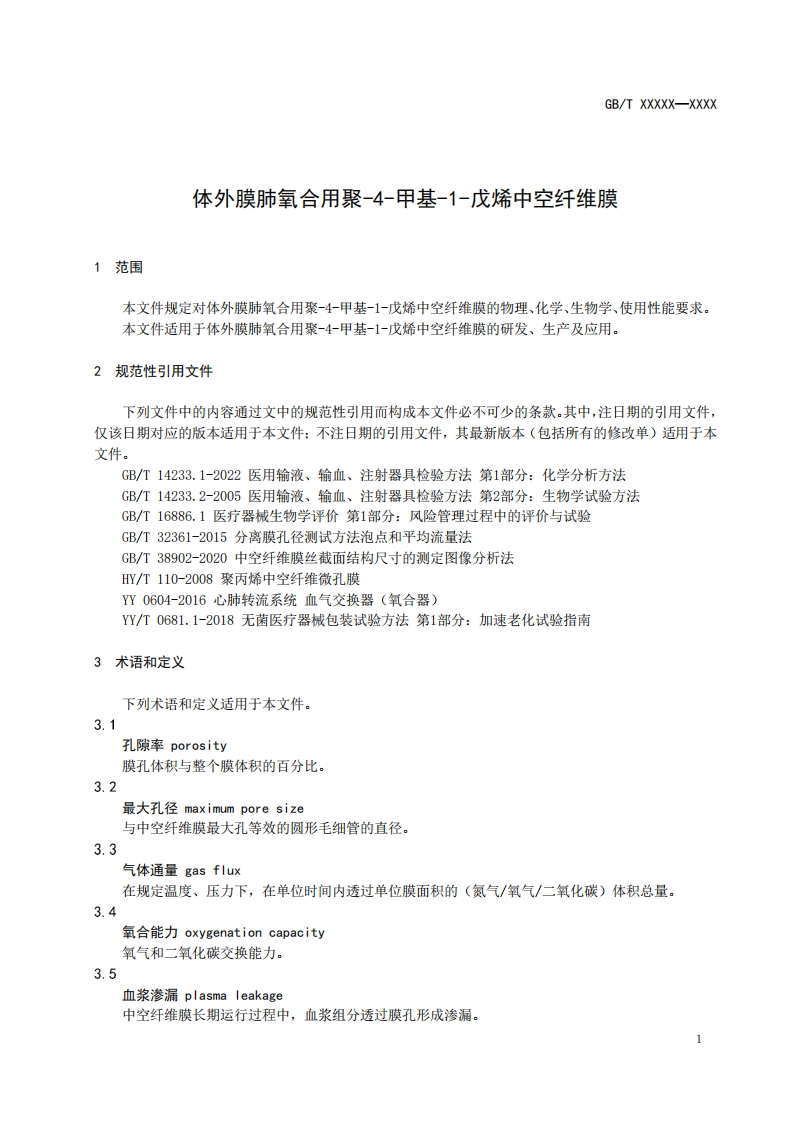 ICS11.120.20CCS C45GB中华人民共和国国家标准GB/T XXXXX-XXXX体外膜肺氧合用聚-4-甲基-1-戊烯中空纤维膜The Poly (4-Methyl-1-Pentene)hollow fiber membrane for extracorporeal membraneoxygenation(ECMO)(点击此处添加与国际标准一致性程度的标识)草案稿在提交反馈意见时,请将您知道的相关专利违同支持性文件一并附上。XXXX-Xx-XX发布XXXX-x-X实施国家市场监督管理总局发布国家标准化管理委员会