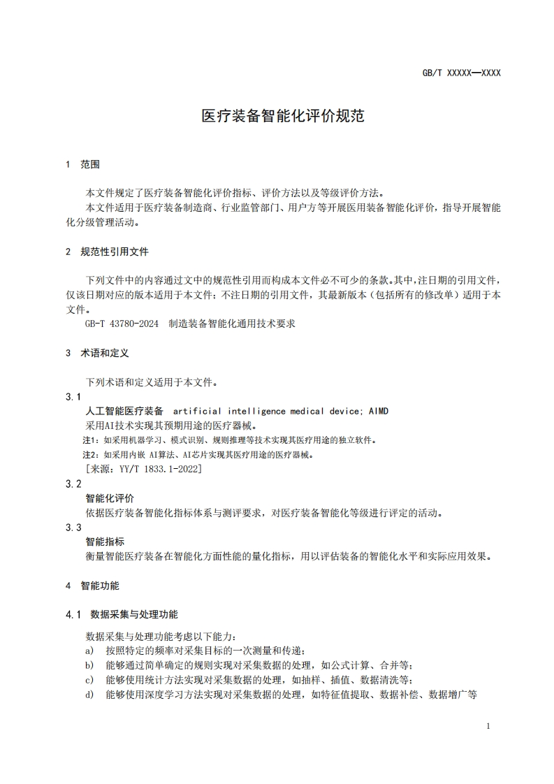 ICSCCS点击此处添加CCS号GB中华人民共和国国家标准GB/T XXXXX-XXXX医疗装备智能化评价规范Specification for the Intelligence Evaluation of Medical Equipment(点击此处添加与国际标准一致性程度的标识)(工作组讨论稿)在提交反馈意见时,请将您知道的相关专利连同支持性文件一并附上。XXXX-Xx-XX发布XXXX-x-X实施国家市场监督管理总局发布国家标准化管理委员会