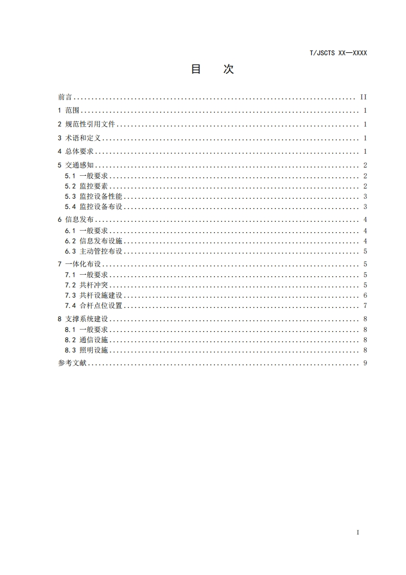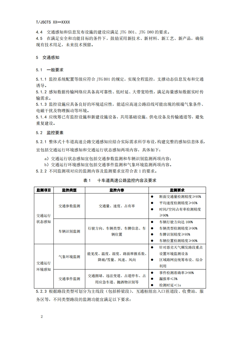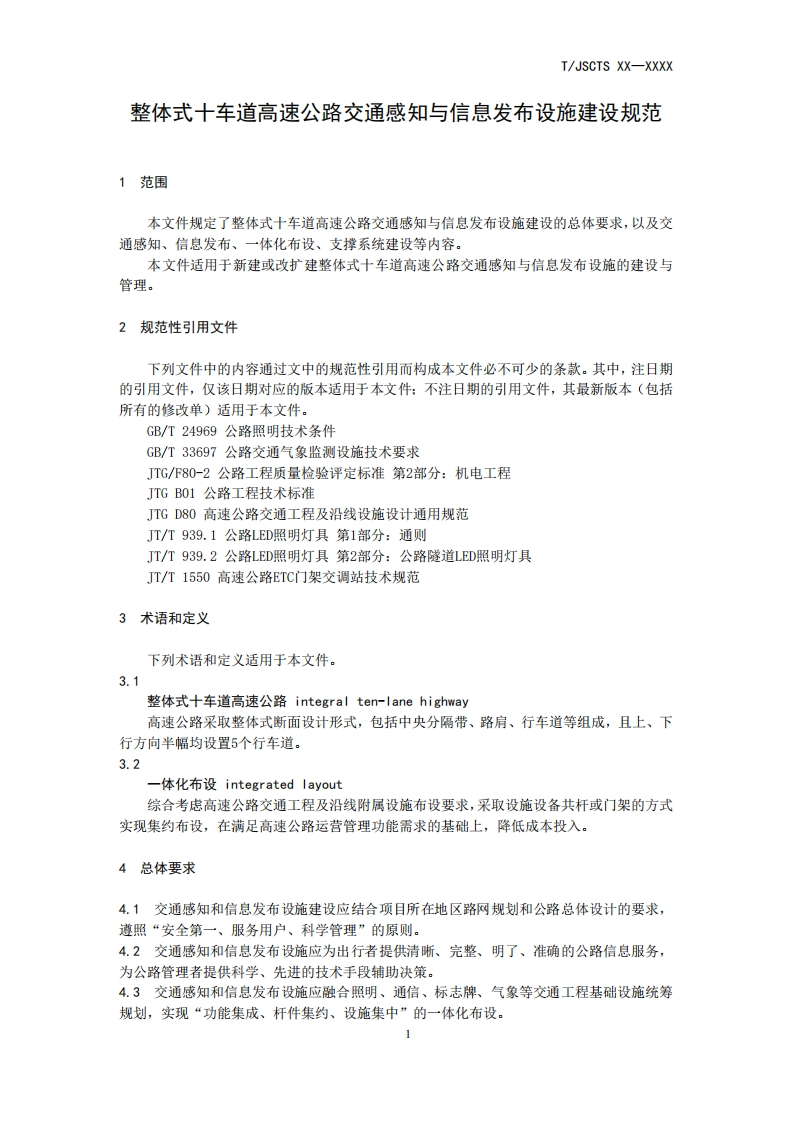 ICS93.080.01CCS R 10团体标准T/JSCTS XX-XXXX整体式十车道高速公路交通感知与信息发布设施建设规范Construction specifications for traffic perception and information release facilities ofintegral ten-lane expressways(征求意见稿)在提交反馈意见时,请将您知道的相关专利连同支持性文件一并附上。XXXX-XX-XX发布XXXX-x-XX实施江苏省综合交通运输学会发布