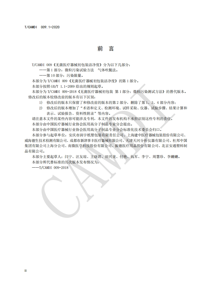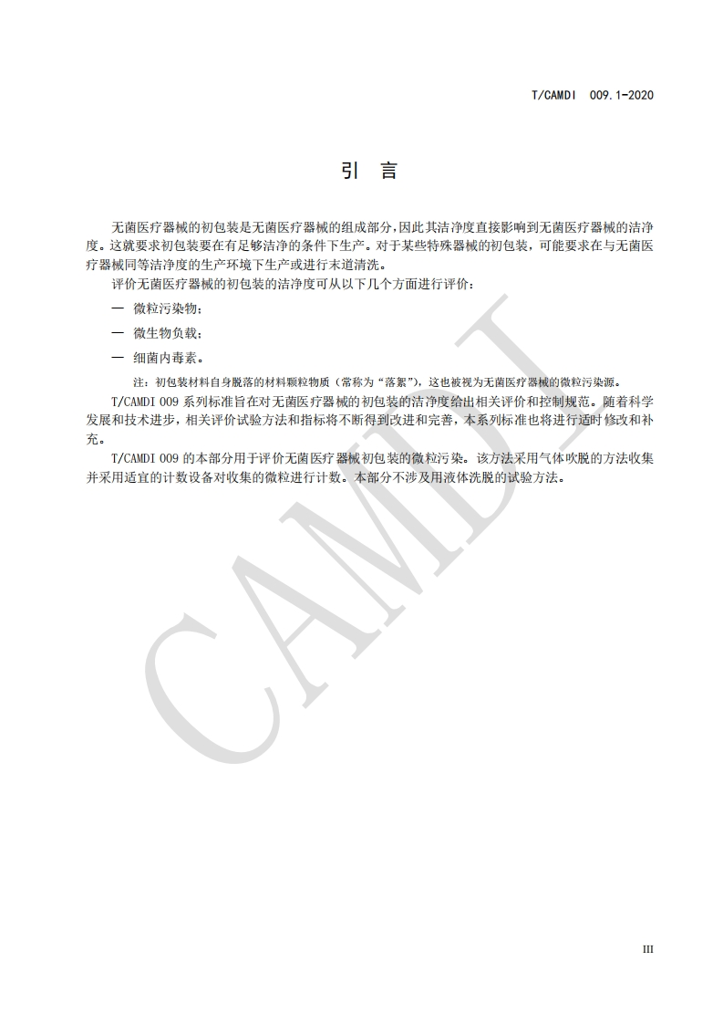 ICS11.020中国医疗器械行业协会China Association for Medical Devices Industry团体标准T/CAMDI009.1-2020代替T/CAMDI009-2018无菌医疗器械初包装洁净度第1部分:微粒污染试验方法气体吹脱法Cleanliness of primary package for sterile medical device-Part 1:Test methods for particulate contamination-Gas elution method2020-02-01发布2020-08-01实施中国医疗器械行业协会发布