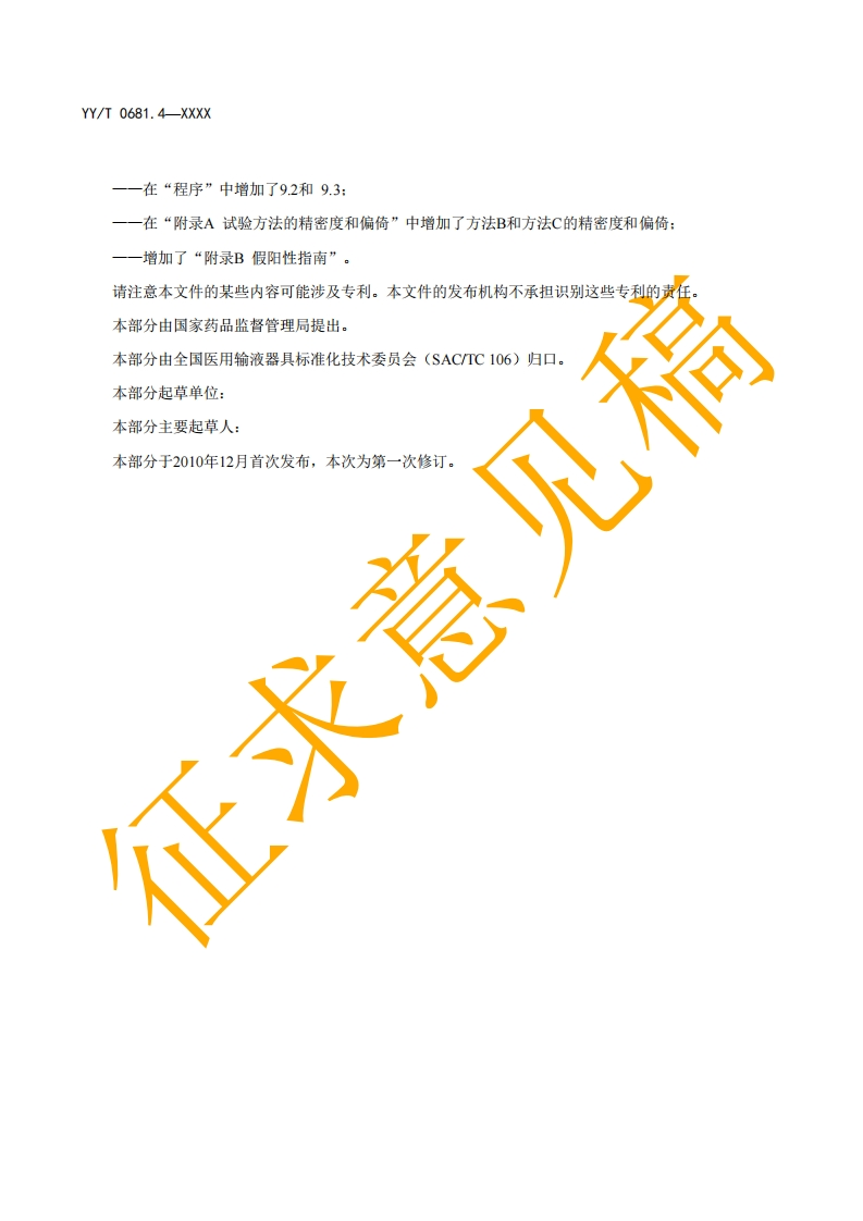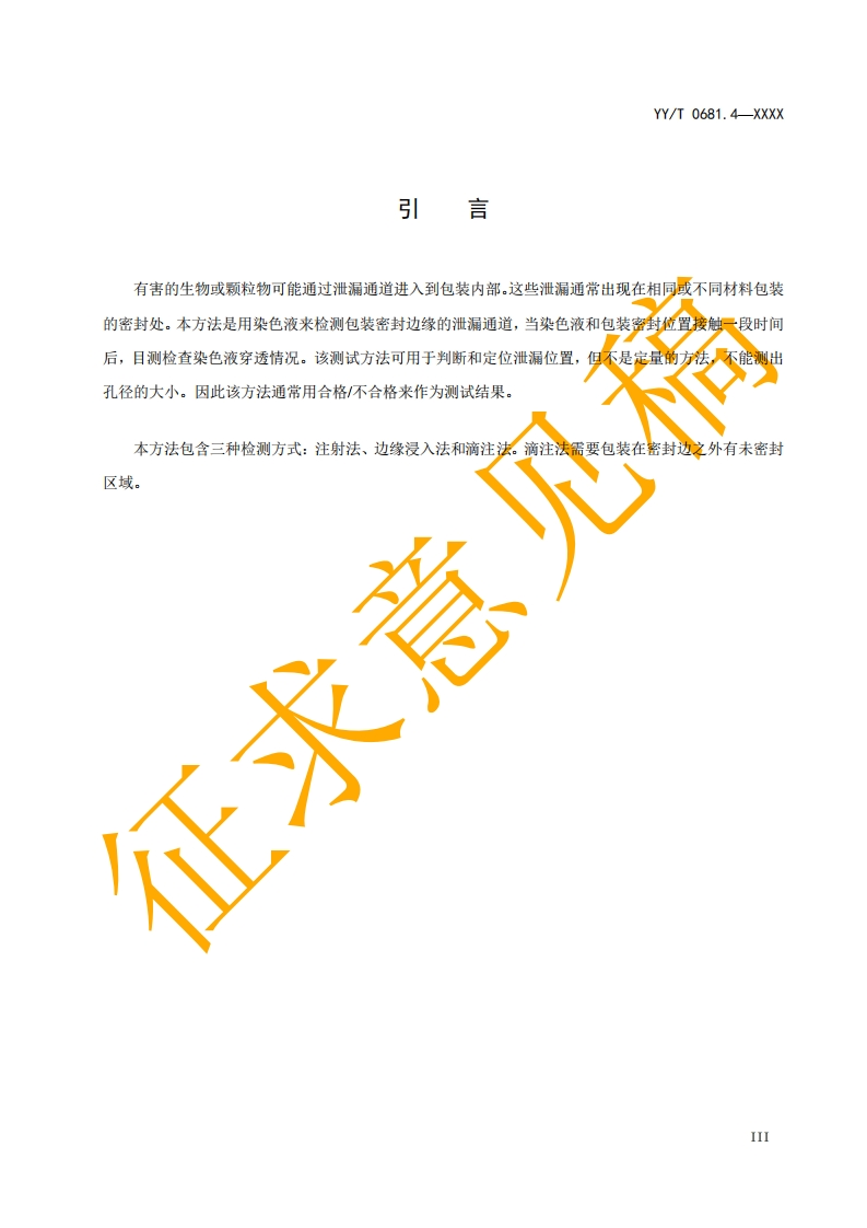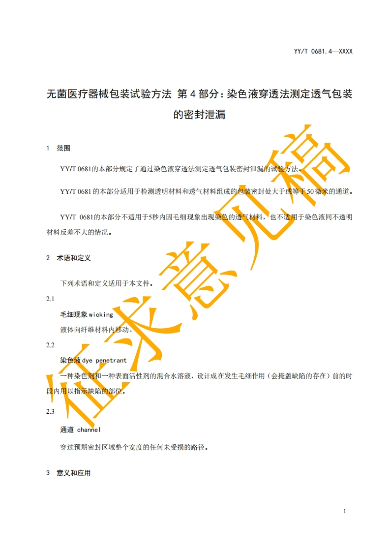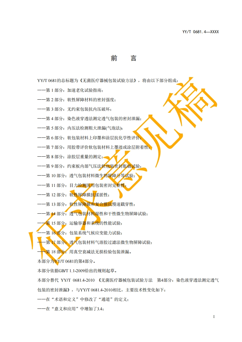 ICS11.080.040C31YY中华人民共和国医药行业标准YY/T0681.4XXXX代替YYT0681.4-2010无菌医疗器械包装试验方法第4部分:染色液穿透法测定透气包装的密封泄漏Test methods for sterile medical device package-Part 4:Detecting seal leaks in porous medical packages by dye penetration(征求意见稿)(本稿完成日期:2019-07-08)上提交反馈意见时,请将您知道的相关专利连同支持性文件一并附上。XXXX-XX-XX发布XXXX-XX-XX实施国家药品监督管理局发布