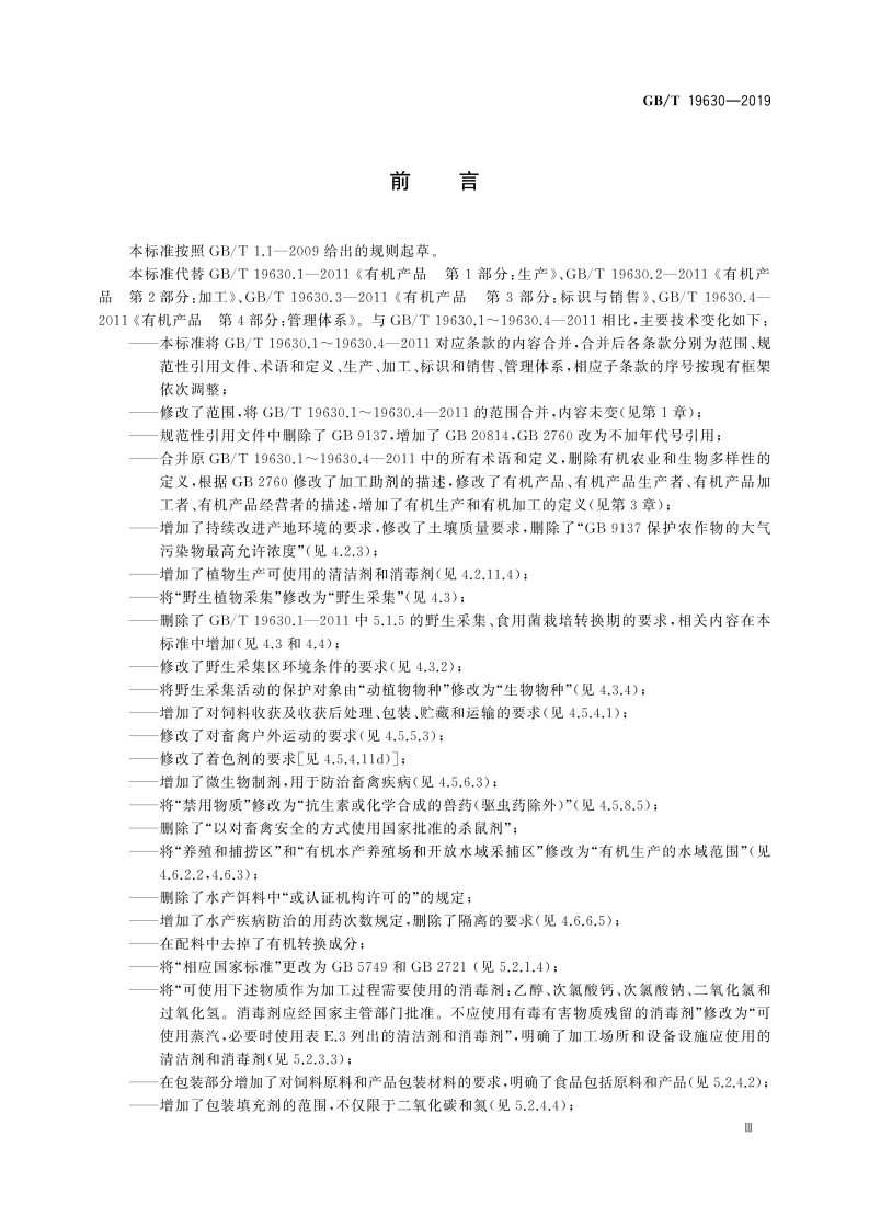 1Cs65.020.01B04GB中华人民共和国国家标准GB/T19630—2019代替GB/T19630.1~19630.4-2011有机产品生产、加工、标识与管理体系要求Organic products-Requirements for production,processing,labeling and management system2019-08-30发布2020-01-01实施国家市场监督管理总局中国国家标准化管理委员会发布