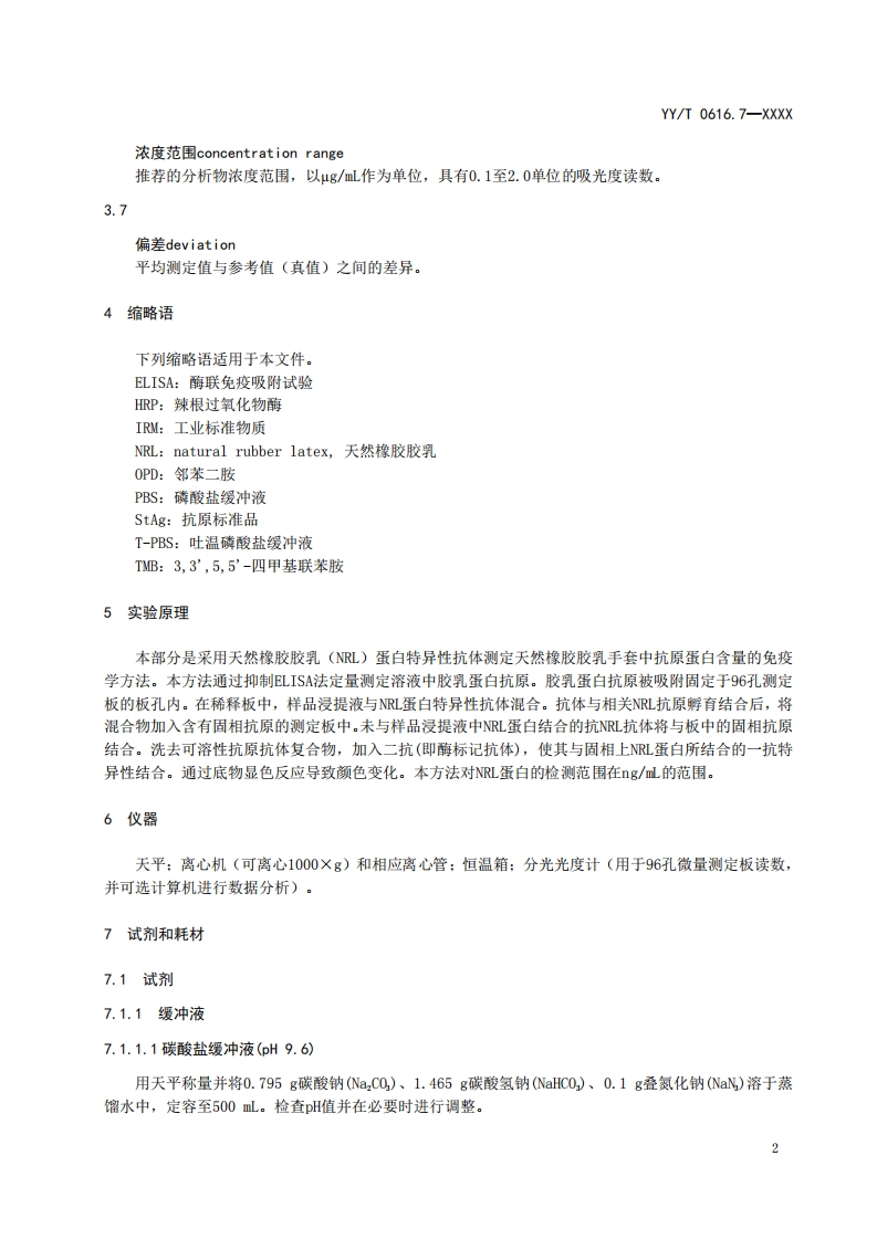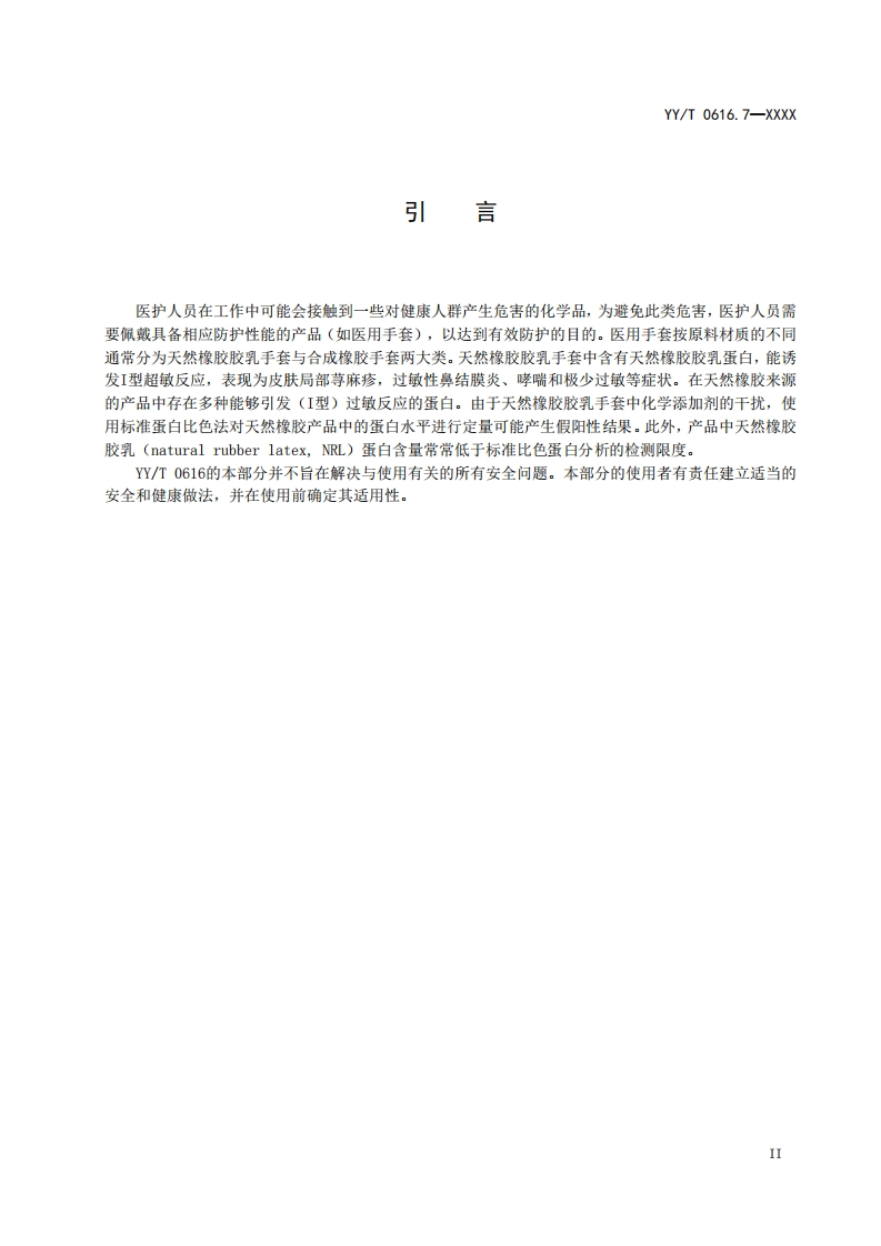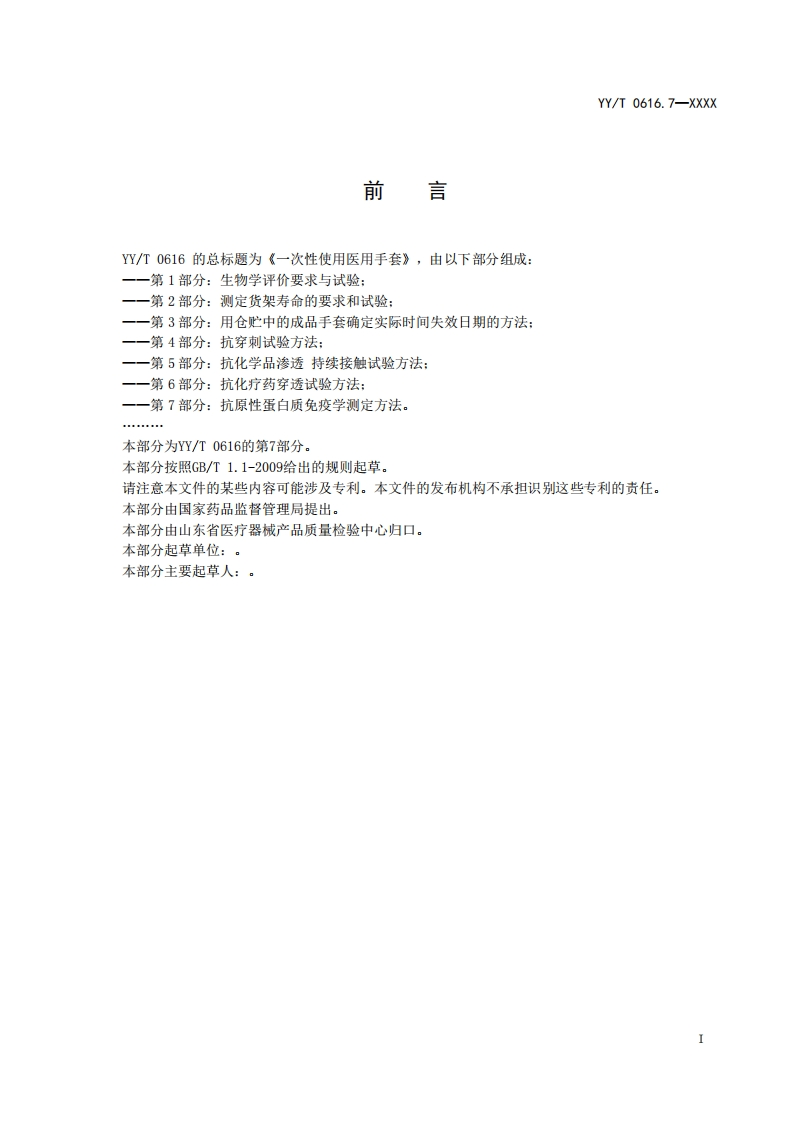 ICS11.140.01030中华人民共和国医药行业标准YY/T0616.7-XXXX次性使用医用手套第7部分:抗原性蛋白质免疫学测定方法Medical gloves for single use-Part 7:Test method for the immunologicalmeasurement ofantigenic protein2019.7.11(征求意见稿)在提交反馈意见时,请将你所知道的相关专利连同支持性文件一并附上。XXXX-Xx-Xx发布XXXX-Xx-Xx实施国家药品监督管理局发布
