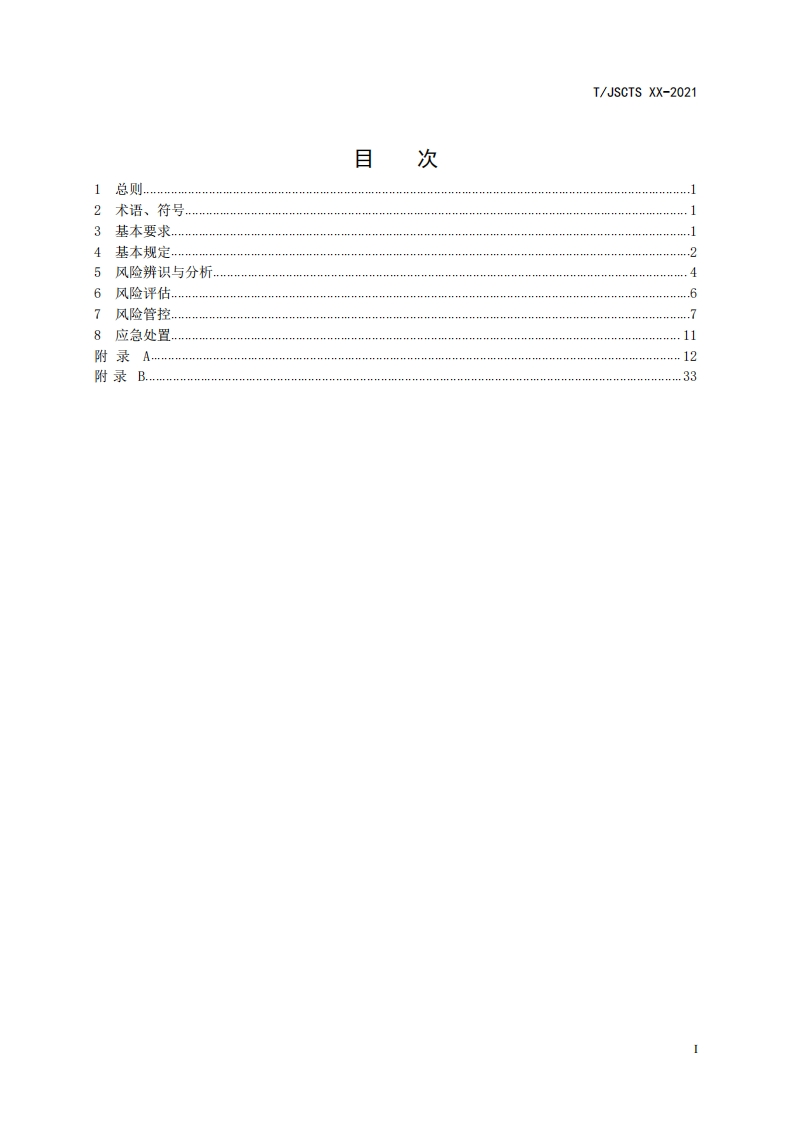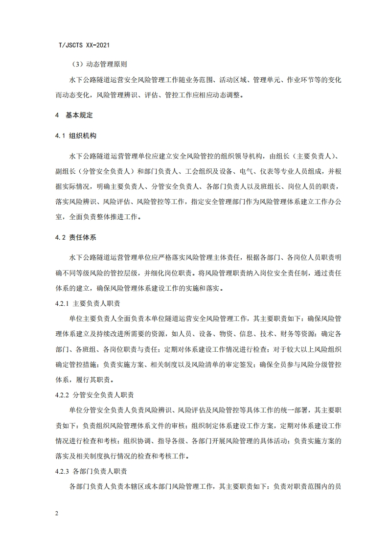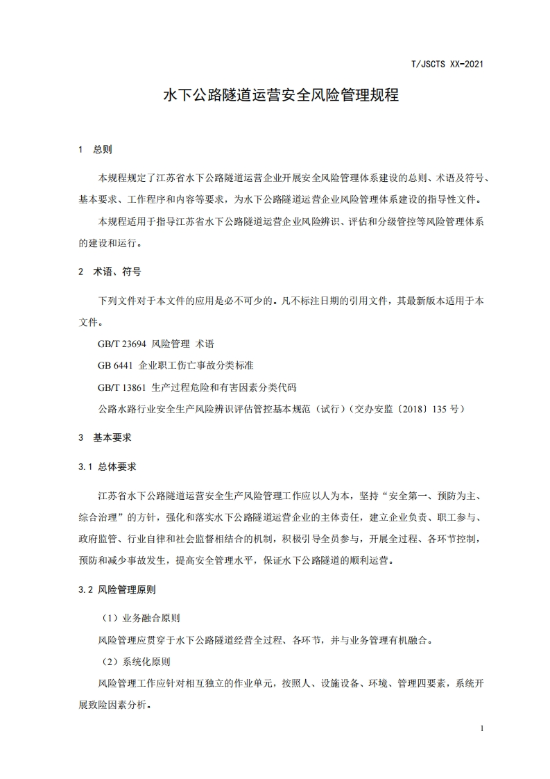 10503.220.20CCS R 80团体标准T/JSCTS×××-2021水下公路隧道运营安全风险管理规程Procedure of Safety Risk Management for Operation of Cross-River Hi ghwayTunnels(征求意见稿)在提交反馈意见时,请将您知道的相关专利连同支持性文件一并附上2021-××-×X发布2021-××-××实施江苏省综合交通运输学会发布