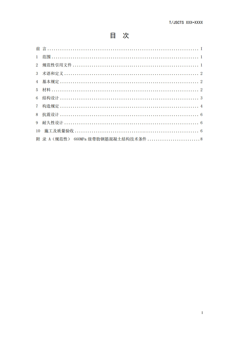 ICS xx.Xx×CCS x xx团体标准T/JSCTS X×X一×X×X水运工程660MPa级带肋钢筋混凝土结构技术规范Technical specification for reinforced concrete structures with 660MParibbed bars of Port and Waterway Engineer ing(征求意见稿)在提交反馈意见时,请将您知道的相关专利连同支持性文件一并附上。×X××-××-××发布××X×-×X-×X实施江苏省综合交通运输学会发布