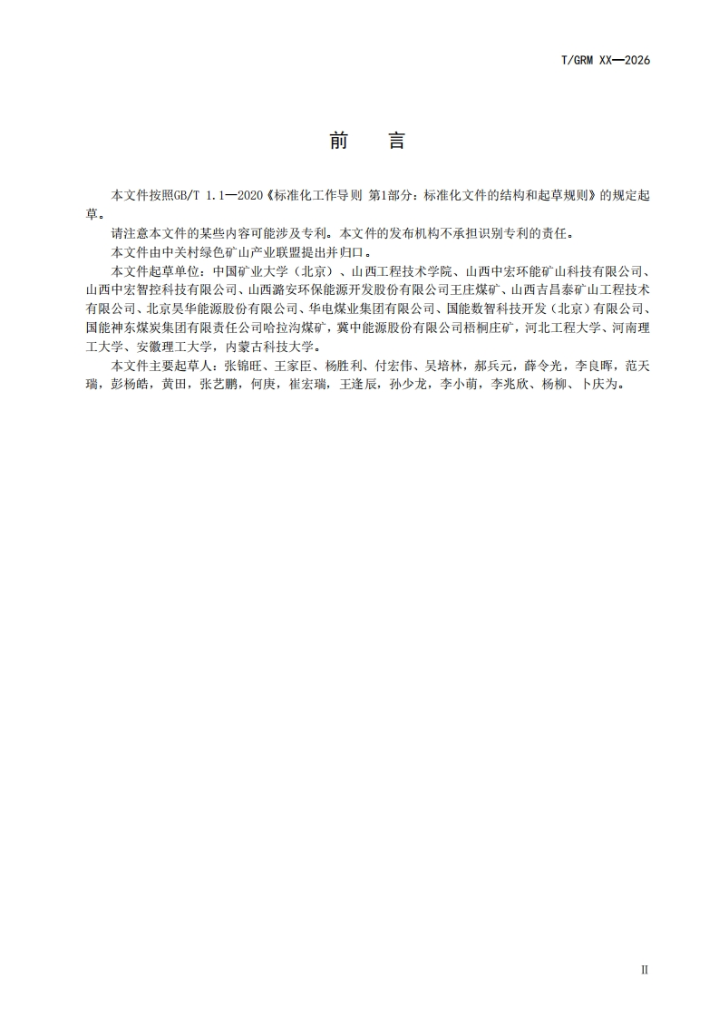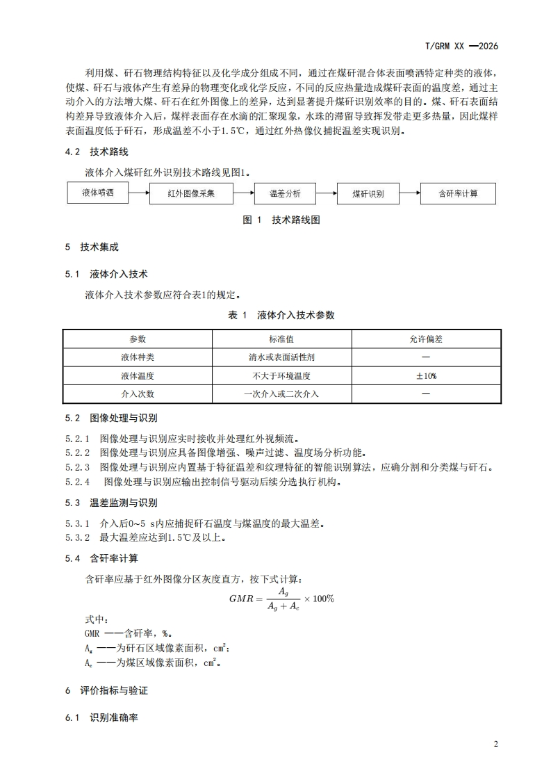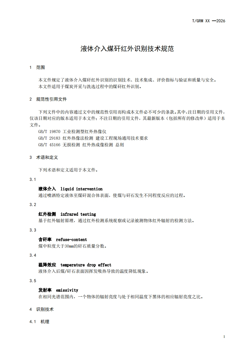 液体介入煤矸红外识别技术规范Technicalspecificationforinfraredidentificationofcoalganguebyliquidintervention348072@abc12小时前发布关注私信0.30MB6页027液体介入煤矸红外识别技术规范Technicalspecificationforinfraredidentificationofcoalganguebyliquidintervention此内容为付费资源,请付费后查看¥19¥23黄金会员免费钻石会员免费立即购买您当前未登录!建议登陆后购买,可保存购买订单付费资源 第1页 / 共6页 第2页 / 共6页 第3页 / 共6页 第4页 / 共6页 第5页 / 共6页 试读已结束,还剩1页,您可下载完整版后进行离线阅读 THE END标准规范 文本预览 TGRM中关村绿色矿山产业联盟团体标准T/GRM XX-2026液体介入煤矸红外识别技术规范Technical specification for infrared identification of coal gangue by liquidintervention征求意见稿2026-XX-XX发布2026-XX-XX实施中关村绿色矿山产业联盟发布 查看更多 收起部分 喜欢就支持一下吧收藏