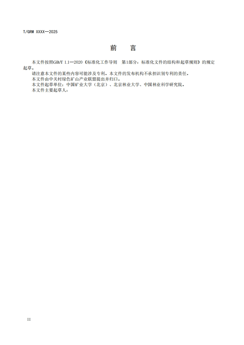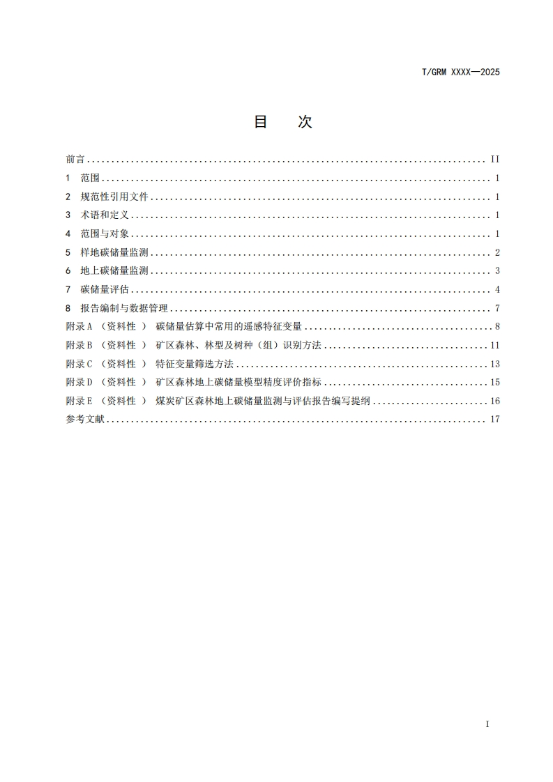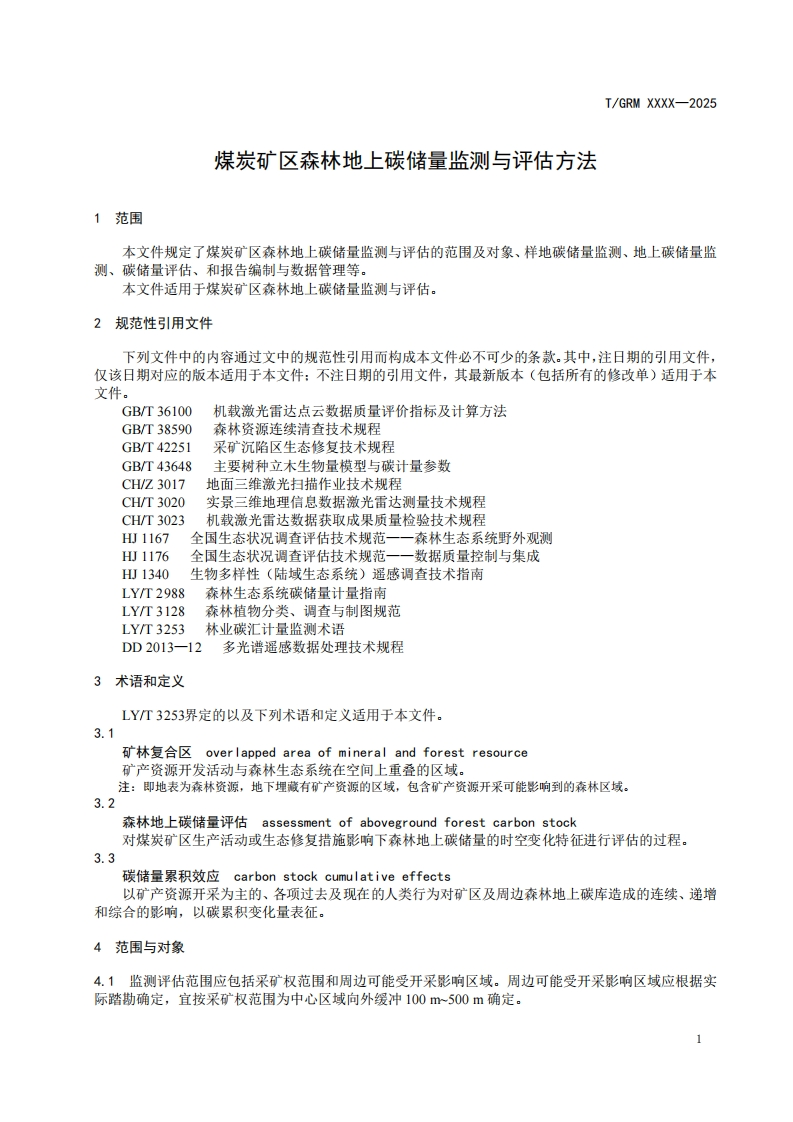 ICS65.020.01CCS B 65I/GRM中关村绿色矿山产业联盟团体标准T/GRM XXXX-2025煤炭矿区森林地上碳储量监测与评估方法Methods for monitoring and assessment of aboveground forest carbon stocks in coalmine area(征求意见稿)在提交反馈意见时,请将您知道的相关专利连同支持性文件一并附上。XXXX-Xx-XX发布XXXX-Xx-XX实施中关村绿色矿山产业联盟发布