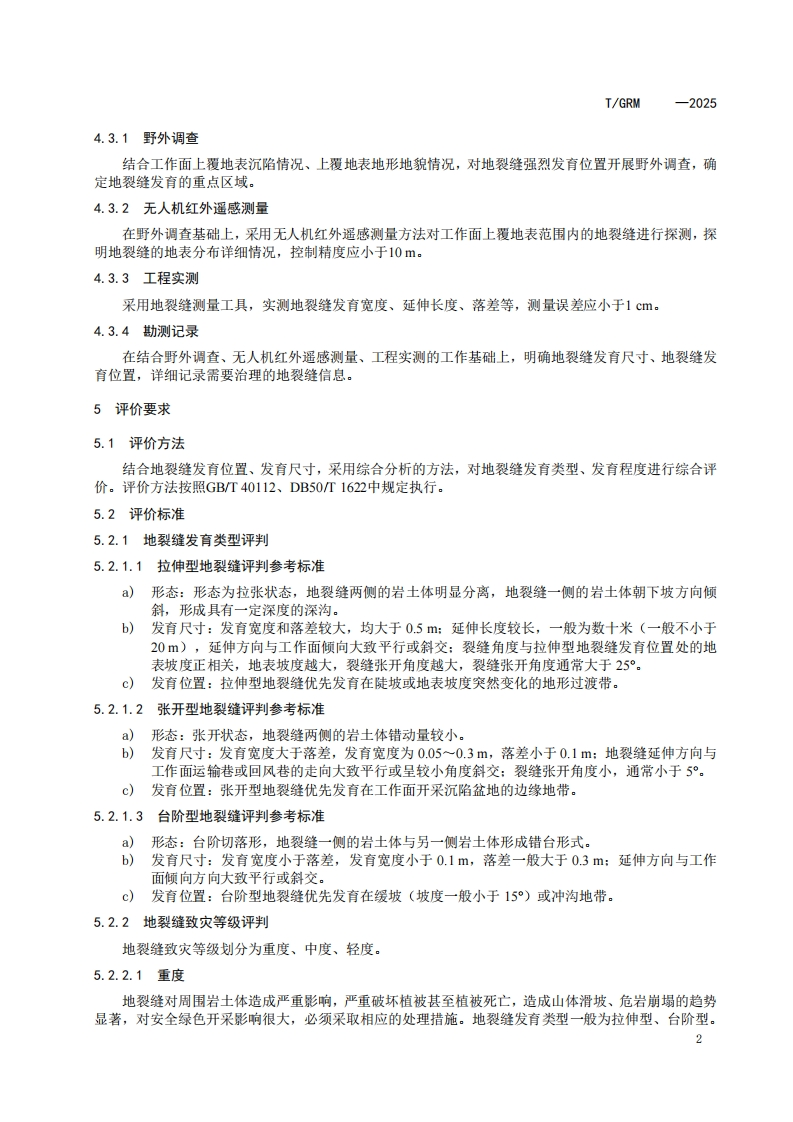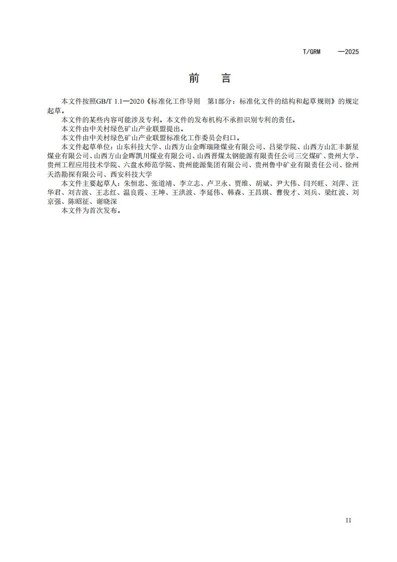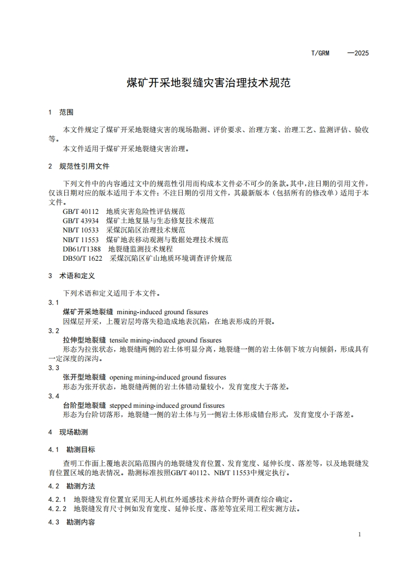 ICS 1CCS点击此处添加CCS号I/GRM中关村绿色矿山产业联盟团体标准T/GRM—2025煤矿开采地裂缝灾害治理技术规范Technical specifications for the management of mining-induced ground fissuredisasters(征求意见稿)(本草案完成时间:2025年9月)在提交反馈意见时,请将您知道的相关专利连同支持性文件一并附上。XXXX-Xx-XX发布XXXX-Xx-XX实施中关村绿色矿山产业联盟发布
