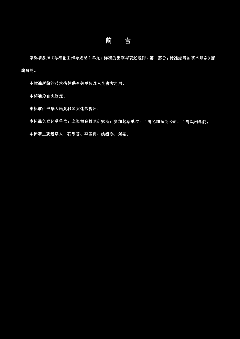 WH_T0204-1999舞台灯具光学质量的测试与评价348072@abc4个月前发布关注私信0.15MB8页045WH_T0204-1999舞台灯具光学质量的测试与评价此内容为付费资源,请付费后查看¥17¥32黄金会员免费钻石会员免费立即购买您当前未登录!建议登陆后购买,可保存购买订单付费资源 第1页 / 共8页 第2页 / 共8页 试读已结束,还剩6页,您可下载完整版后进行离线阅读 THE END标准规范 文本预览 W囬中华人民共和国文化行业标准WH/T0204-1999舞台灯具光学质量的测试与评价The Test and Evaluation for OpticsQuality of Stage Luminaries1999一11一19发布1999一12一20实施中华人民共和国文化部发布 查看更多 收起部分 喜欢就支持一下吧收藏