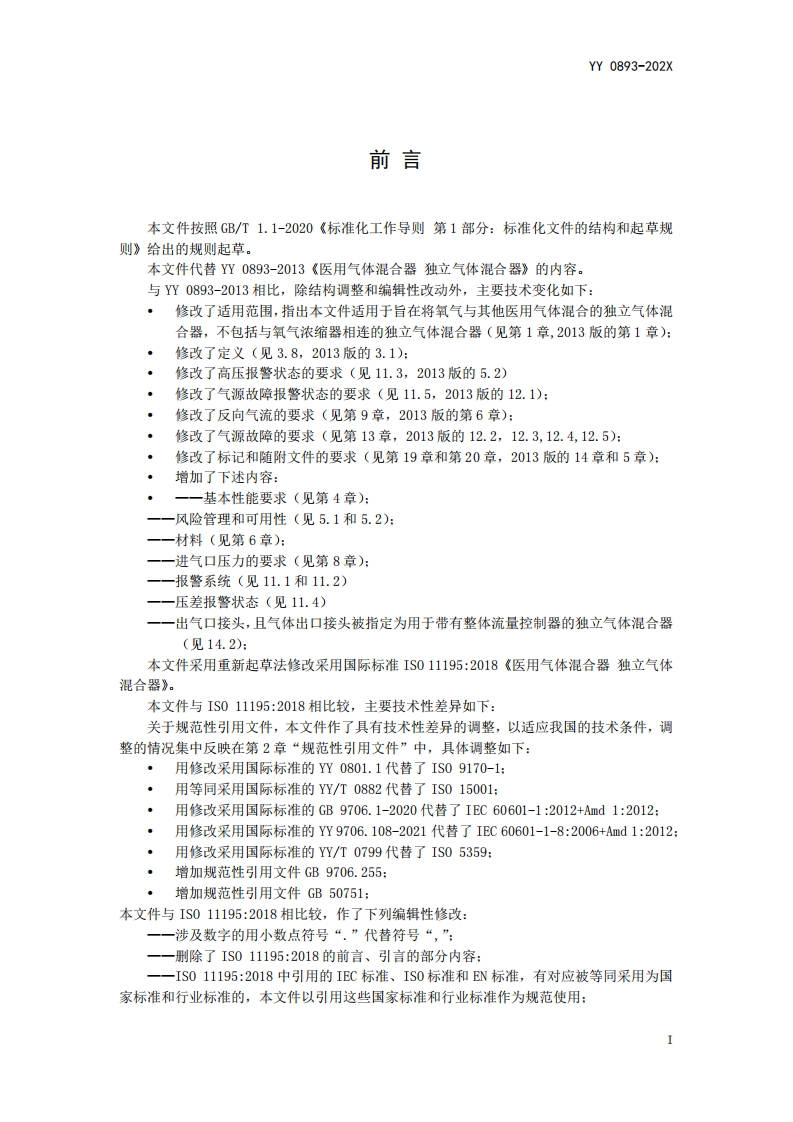 YY0893-202XICS11.040.10C46中华人民共和国医药行业标准YY0893-202X代替YY0893-2013医用气体混合器独立气体混合器Gas mixers for medical use-Standalone gas mixers(IS011195:2018,M0D)(工作组讨论稿)202X-XX-XX发布202X-XX-XX实施国家药品监督管理局发布