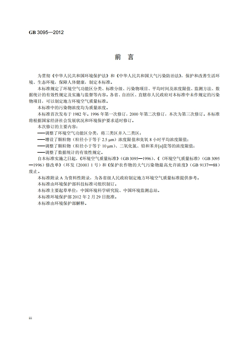 环境空气质量标准348072@abc前天发布关注私信0.28MB12页020环境空气质量标准此内容为付费资源,请付费后查看¥19¥23黄金会员免费钻石会员免费立即购买您当前未登录!建议登陆后购买,可保存购买订单付费资源 第1页 / 共12页 第2页 / 共12页 第3页 / 共12页 第4页 / 共12页 第5页 / 共12页 试读已结束,还剩7页,您可下载完整版后进行离线阅读 THE END标准规范 文本预览 附件:ICS13.040.20Z50中华人民共和国国家标准GB3095-2012代替GB3095一1996GB9137一88环境空气质量标准Ambient air quality standards本电子版为发布稿。请以中国环境科学出版社出版的正式标准文本为准。2012-02-29发布2016-01-01实施环境保护部发布国家质量监督检险检疫总局 查看更多 收起部分 喜欢就支持一下吧收藏