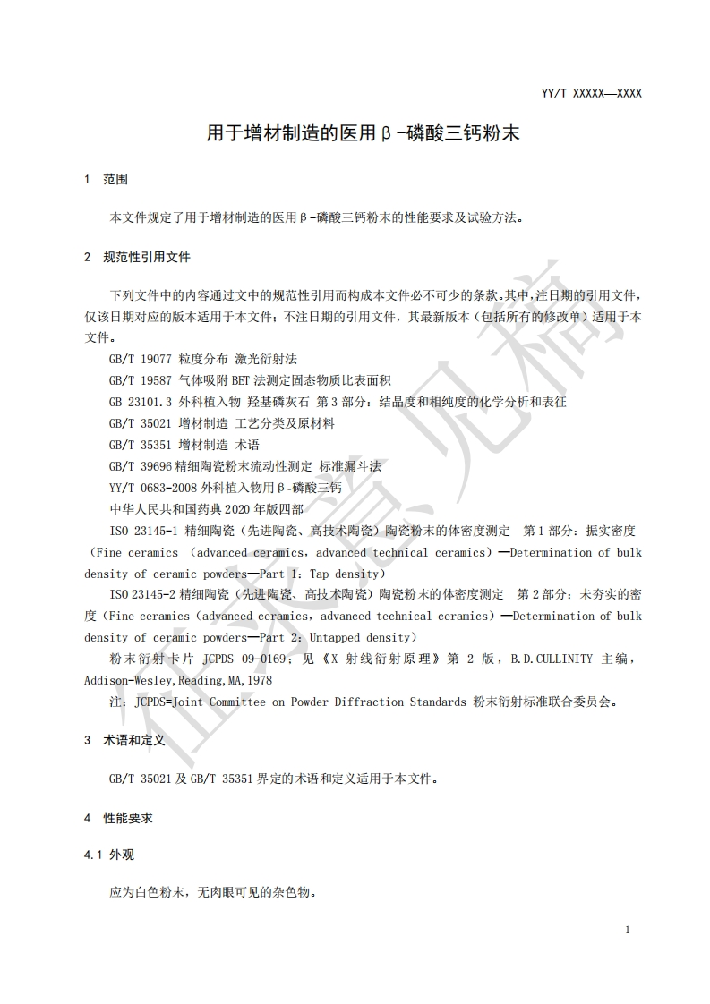 1CS11.040.30C30中华人民共和国医药行业标准YY/TXXXXXXXXX用于增材制造的医用B-磷酸三钙粉末Medical grade beta-tricalcium phosphate powder used for additive manufacturing(征求意见稿)在提交反馈意见时,请将您知道的相关专利连同支持性文件一并附上。XXXX-XX-XX发布XXXX-XX-XX实施国家药品监督管理局发布