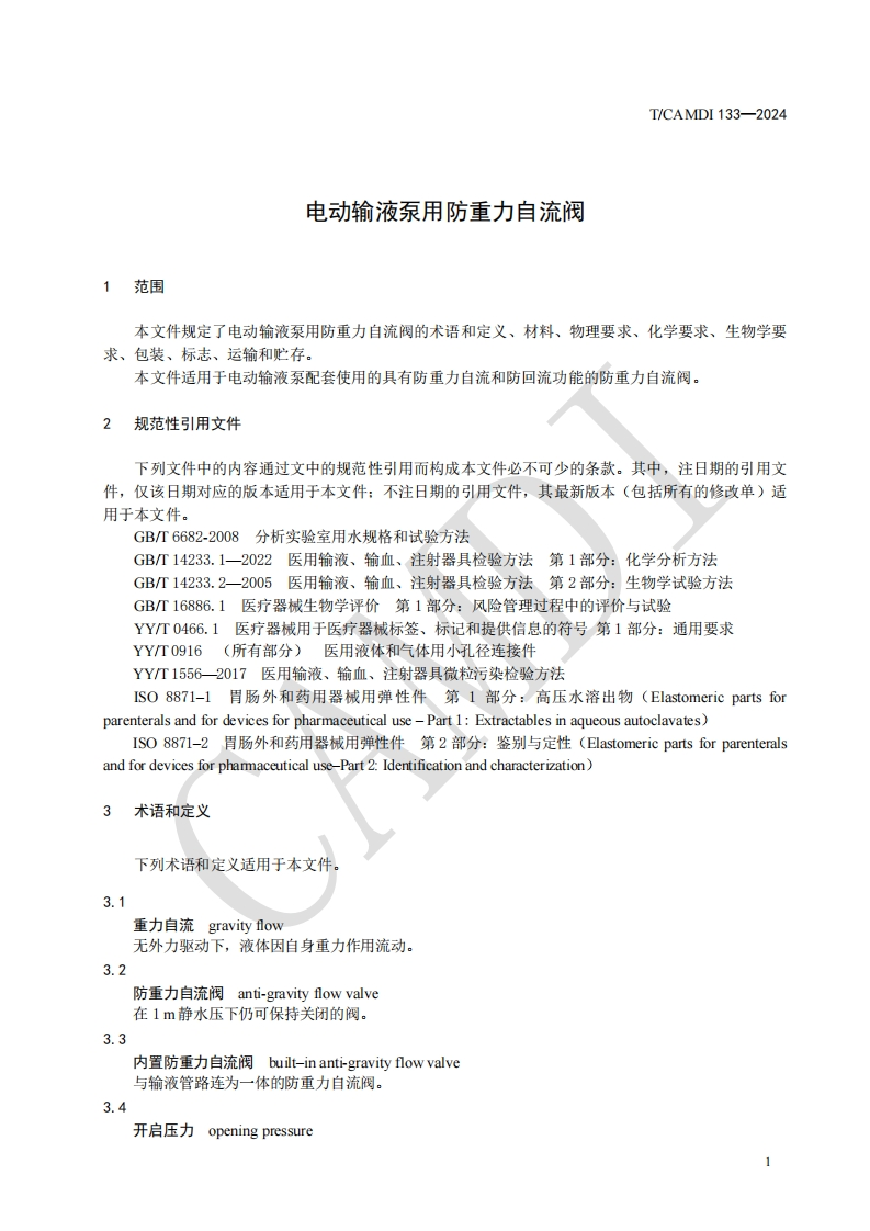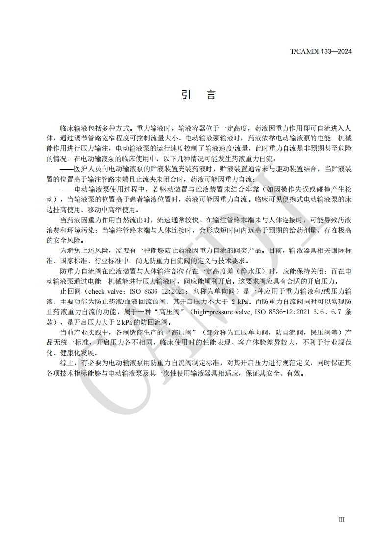 电动输液泵用防重力自流阀Anti-Gravity-FlowValvesforElectricalInfusionPump348072@abc昨天发布关注私信0.95MB19页043电动输液泵用防重力自流阀Anti-Gravity-FlowValvesforElectricalInfusionPump此内容为付费资源,请付费后查看¥19¥23黄金会员免费钻石会员免费立即购买您当前未登录!建议登陆后购买,可保存购买订单付费资源 第1页 / 共19页 第2页 / 共19页 第3页 / 共19页 第4页 / 共19页 第5页 / 共19页 试读已结束,还剩14页,您可下载完整版后进行离线阅读 THE END标准规范 文本预览 ICS11.040.20CCS C 31中国医疗器械行业协会China Association for Medical Devices Industry团体标准T/CAMDI133-2024电动输液泵用防重力自流阀Anti-Gravity-Flow Valves for Electrical Infusion Pump2024-12-31发布2025-1-3实施中国医疗器械行业协会发布 查看更多 收起部分 喜欢就支持一下吧收藏