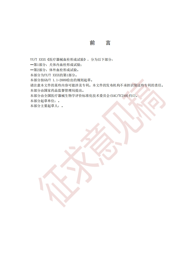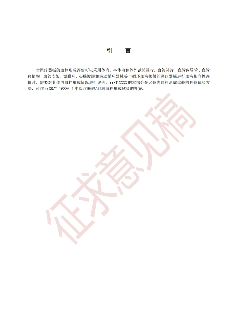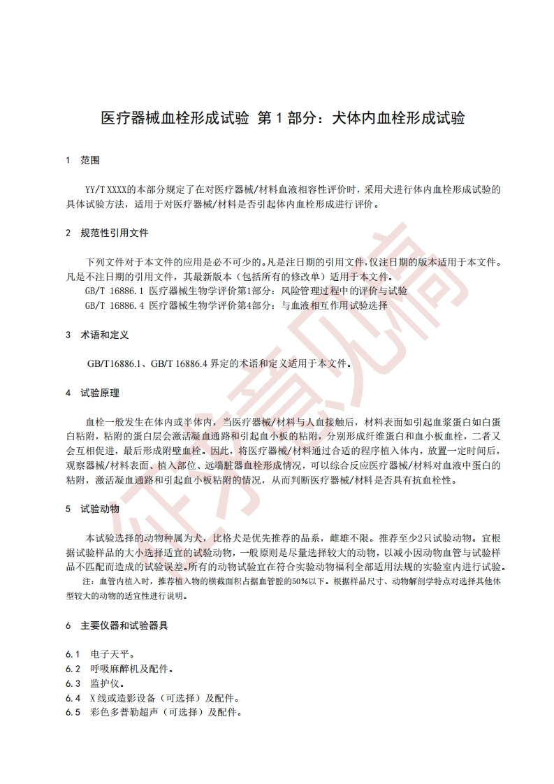 ICs11.040.01C30中华人民共和国医药行业标准YY/T XXXX.1-XXXX医疗器械血栓形成试验第1部分:犬体内血栓形成试验Test method for thrombogenicity study-Part 1:Thrombogenicity study in dogs invascular点击此处添加与国际标准一致性程度的标识征求意见稿2019.7.5在提交反馈意见时,请将你所知道的相关专利连同支持性文件一并附上。XXXX-Xx-Xx发布XXXX-XX-XX实施国家药品监督管理局发布