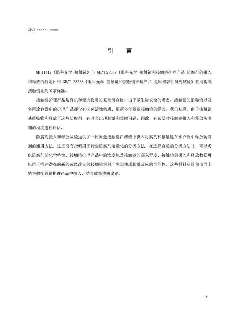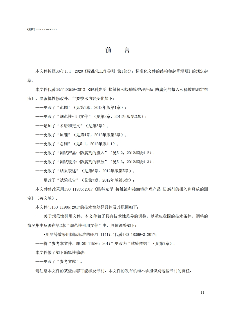 ICS11.040.70CCS C40中华人民共和国国家标准GB/T28539一XX×X代替GB/T28539-2012眼科光学接触镜和接触镜护理产品防腐剂的摄入和释放的测定Ophthalmic optics-Contact lenses and contact lens care products-Determination of preservative uptake and release(IS011986:2017,M0D)(征求意见稿)××X一××一X×发布××××-××-实施国家市场监督管理总局发布中国国家标准化管理委员会