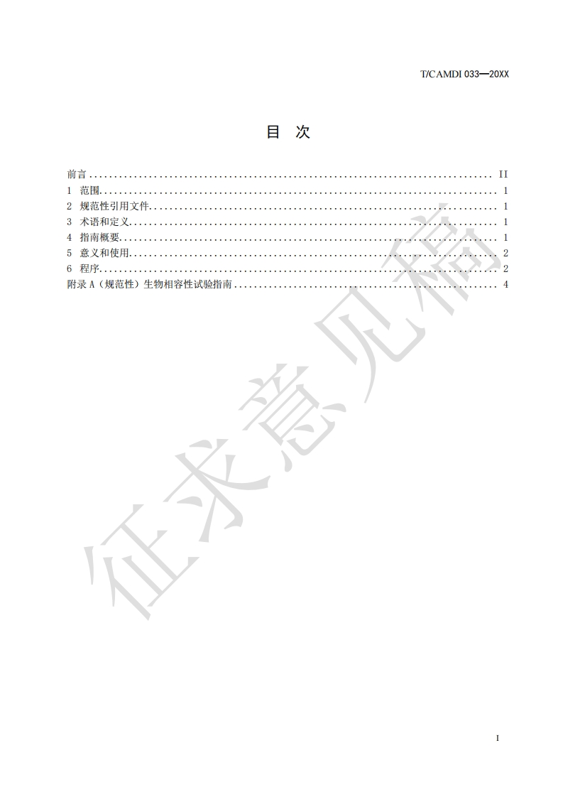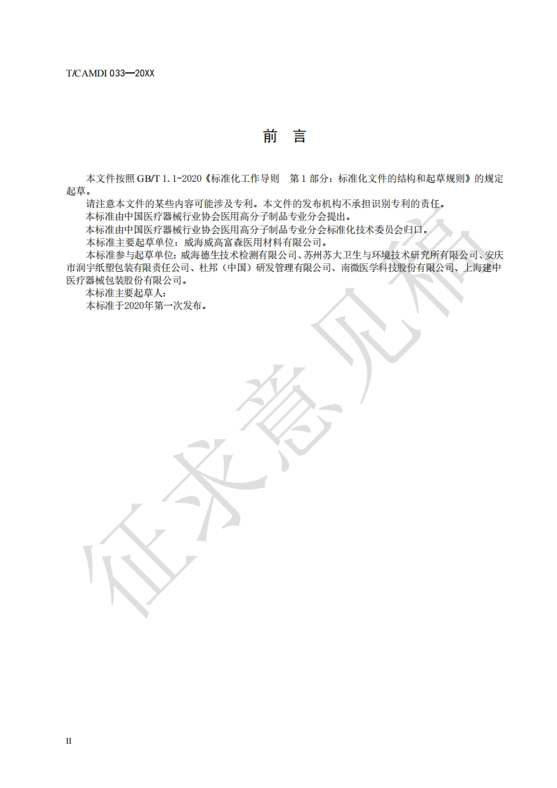 ICS11.040.20CCS C 30中国医疗器械行业协会China Association for Medical Devices Industry团体标准T/CAMDI033/CD-××××代替T/CAMDI033-2020医疗器械包装材料的生物学评价指南Guide for biological evaluation of packaging materials for medical devices(征求意见稿CD)在提交反馈意见时,请将您知道的相关专利连同支持性文件一并附上。××X×-X×-××发布××××-××-××实施中国医疗器械行业协会发布