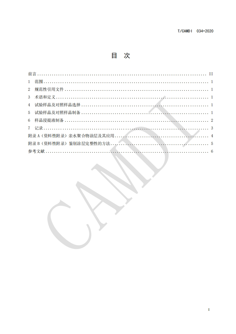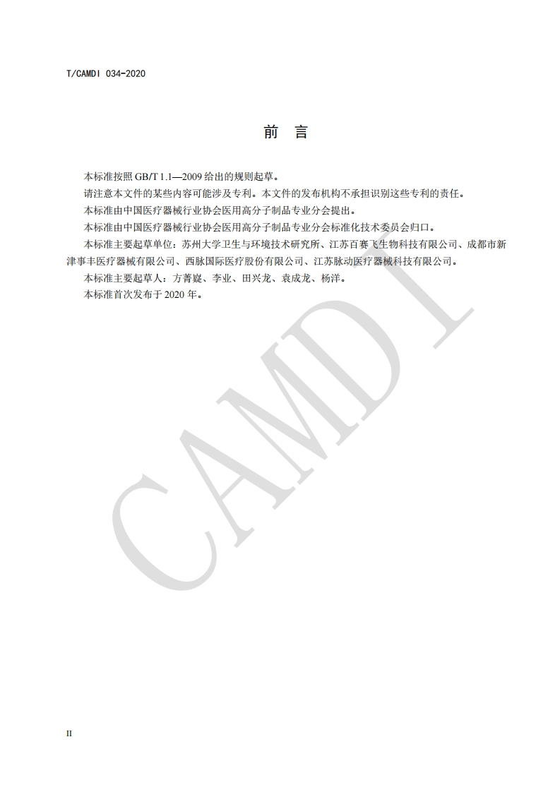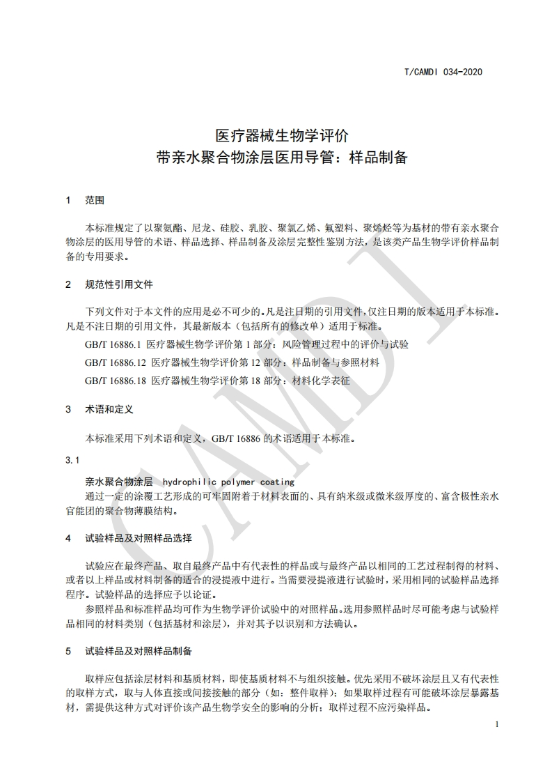 ICS11.020中国医疗器械行业协会China Association for Medical Devices Industry团体标准T/CAMDI034-2020医疗器械生物学评价带亲水聚合物涂层医用导管:样品制备Biological evaluation of medical devicesMedical catheter with hydrophilic polymer coating:Sample preparation2020-02-01发布2020-08-01实施中国医疗器械行业协会发布
